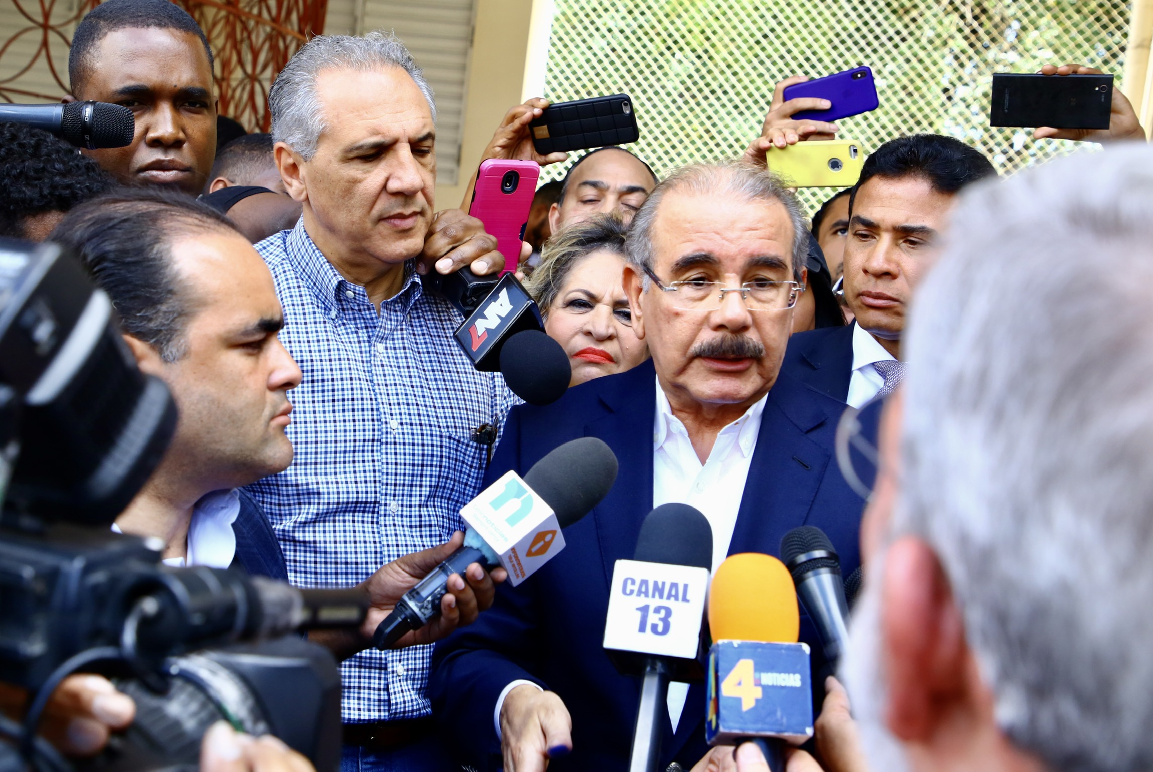 El presidente Danilo Medina mientras responde a periodista luego de ejercer su derecho al voto, en la Casa Provincial Hijas de María Auxiliadora del sector Don Bosco, del Distrito Nacional.