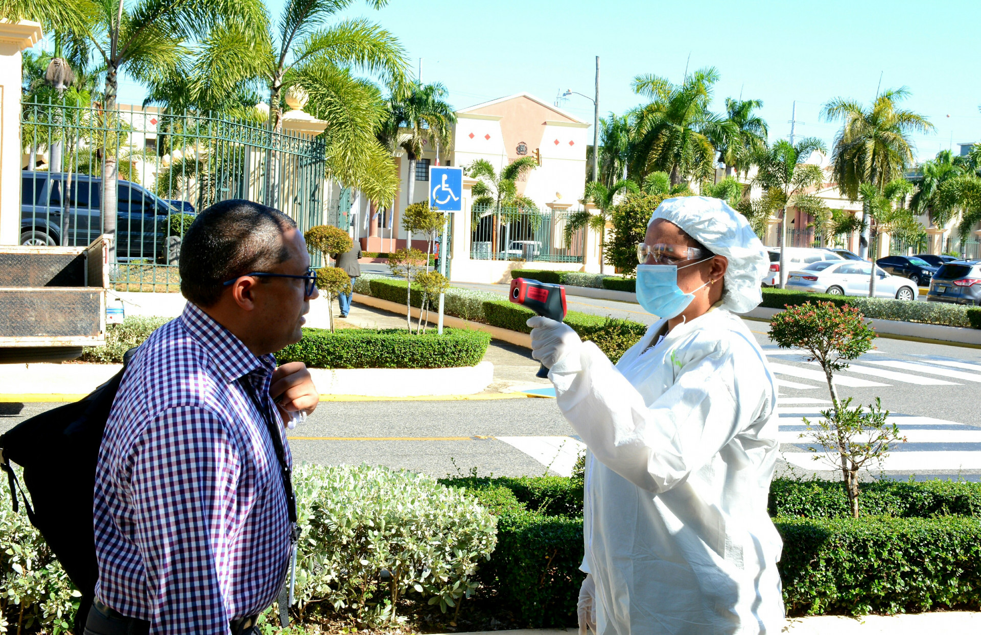 Personal del Servicio Médico Palacio Nacional revisa con pistolas de temperatura a todo el personal