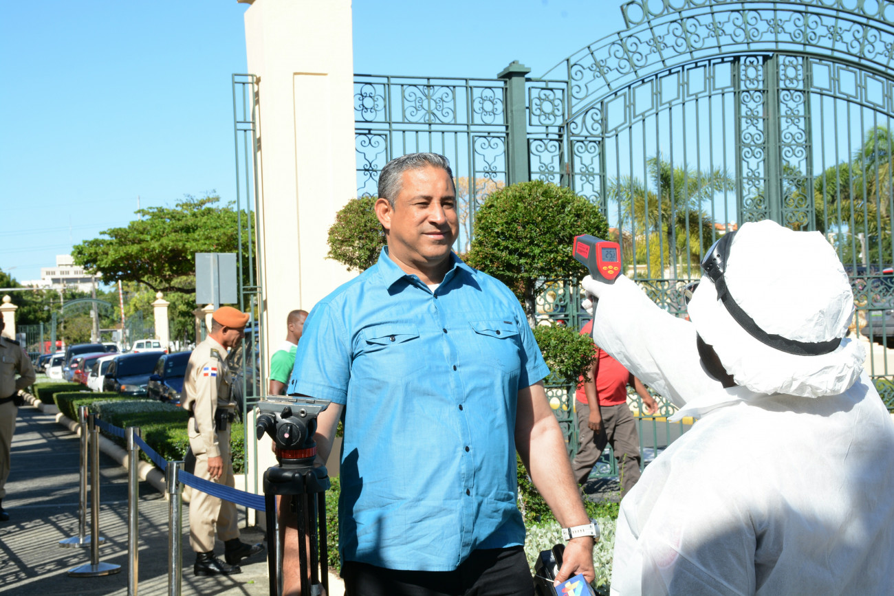 Personal del Servicio Médico Palacio Nacional revisa con pistolas de temperatura a todo el personal