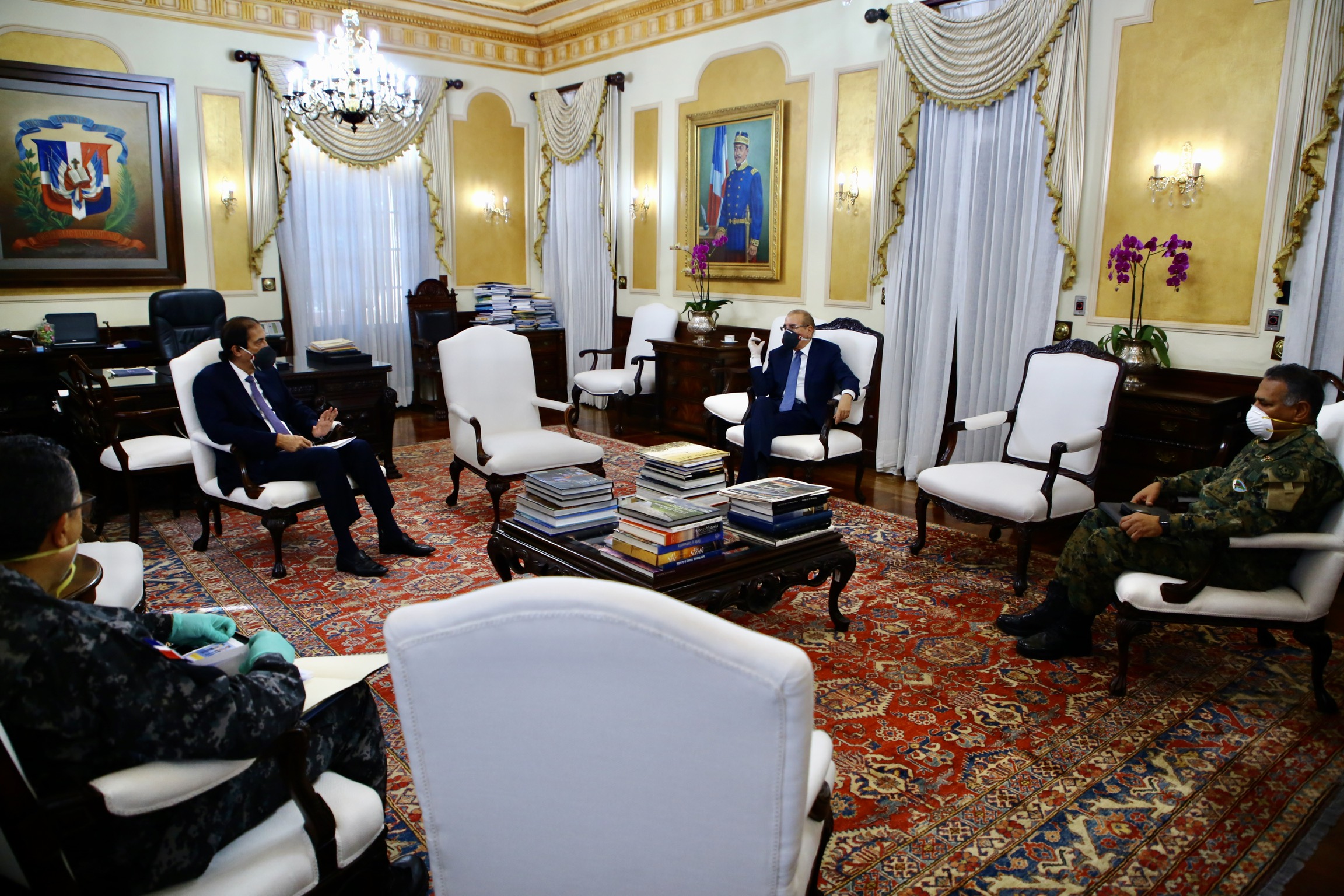 El presidente Danilo Medina encabezó la mañana de hoy una reunión con los ministros de la Presidencia, Gustavo Montalvo, y de Defensa, teniente general Rubén Darío Paulino Sem; así como con el director de la Policía Nacional, mayor general Ney Aldrin Bautista Almonte. Despacho presidencial del Palacio Nacional.
