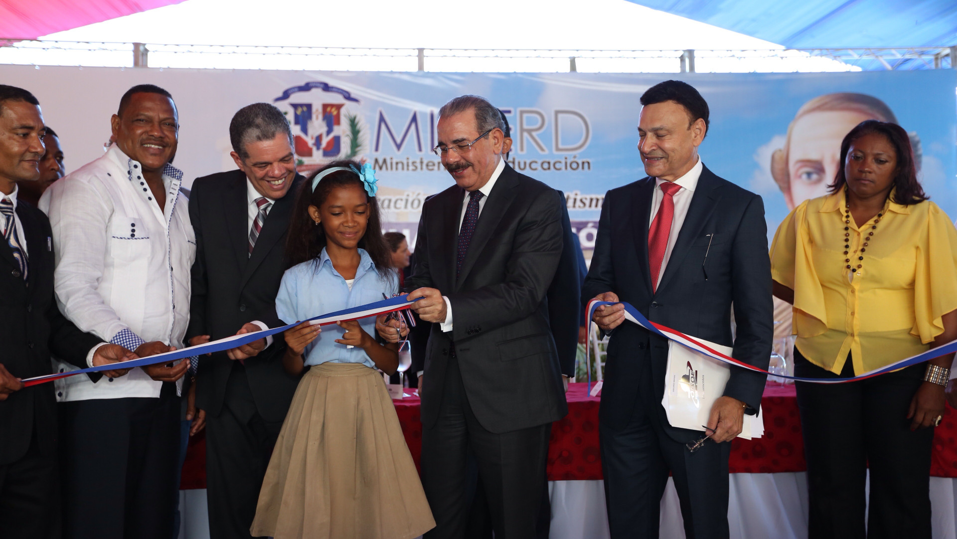 El presidente Danilo Medina realiza el corte de cinta para dejar formalmente inaugurados los nuevos planteles escolares en la comunidad de Miches.