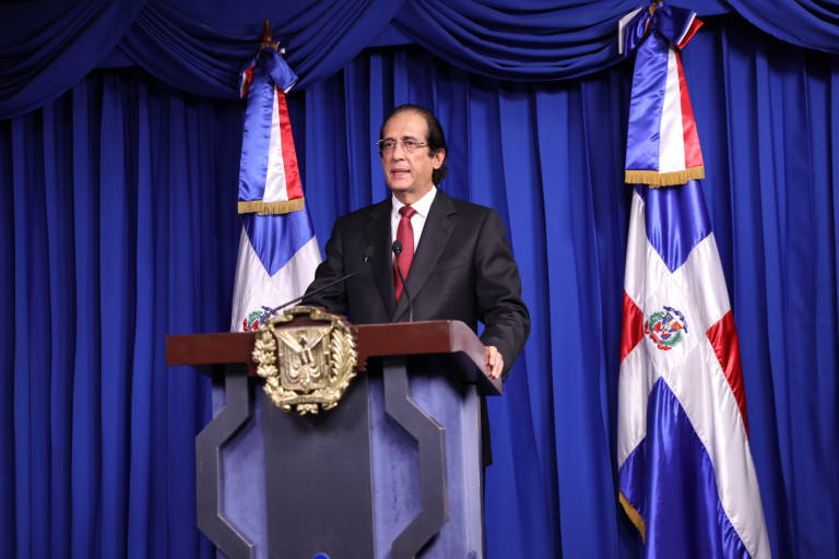 Gustavo Montalvo, ministro de la Presidencia y coordinador de la Comisión de Alto Nivel para la Prevención y el Control del Coronavirus (COVID-19), durante declaraciones por teleconferencia desde el Salón Orlando Martínez, del Palacio Nacional.