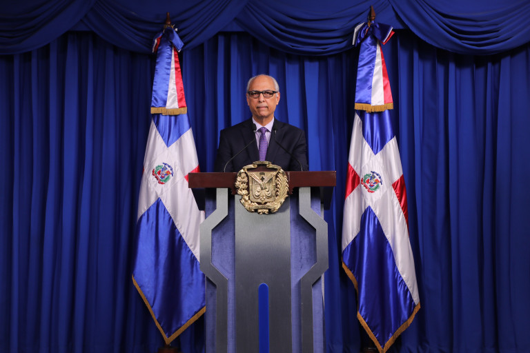 Dr. Flavio Darío Espinal, consultor jurídico del Poder Ejecutivo, durante conferencia de prensa para ofrecer la información a nombre del Gobierno dominicano, desde el Salón Orlando Martínez en el Palacio Nacional.