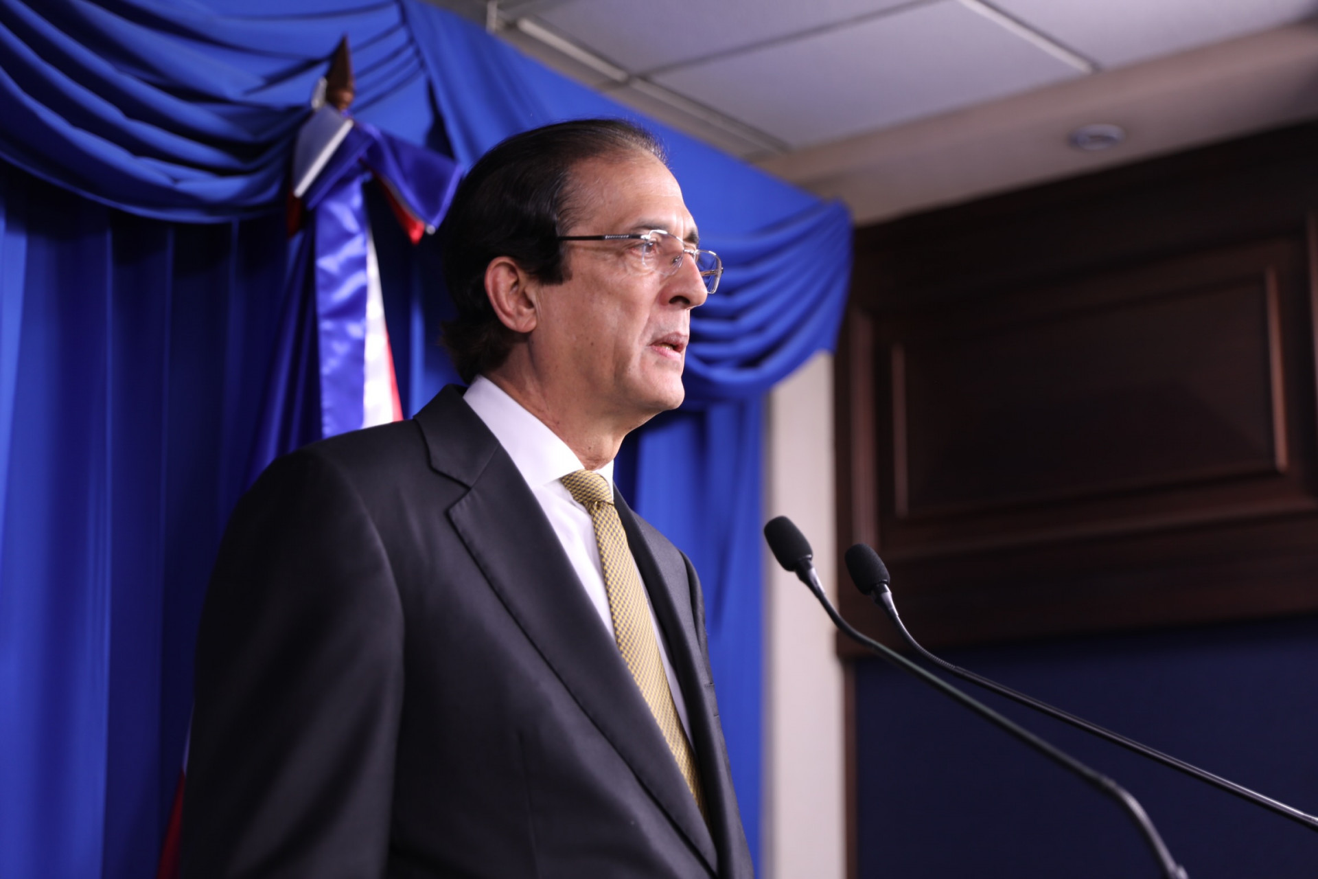 Ministro de la Presidencia, Gustavo Montalvo, en su calidad de coordinador de la Comisión de Alto Nivel para la Prevención y el Control del COVID-19, al ofrecer la información desde el Salón Orlando Martínez en el Palacio Nacional.