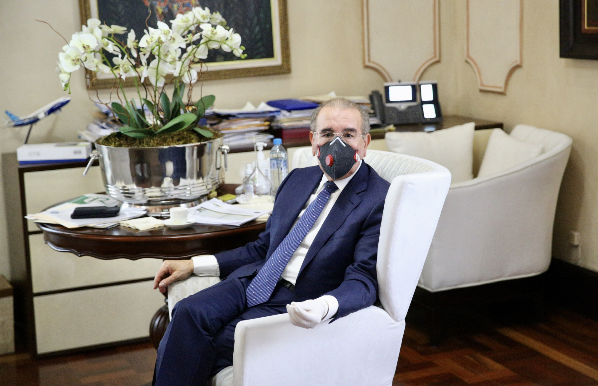 Presidente Danilo Medina durante reunión de hoy con el el gobernador del Banco Central y el ministro de Haciendas, en el Salón Privado del Palacio Nacional.