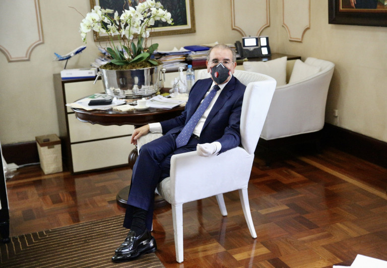 Presidente Danilo Medina durante la reunión de trabajo que se realizó con todas las medidas preventivas, incluyendo la distancia física de poco más de un metro entre cada participante y el uso de mascarillas y guantes.