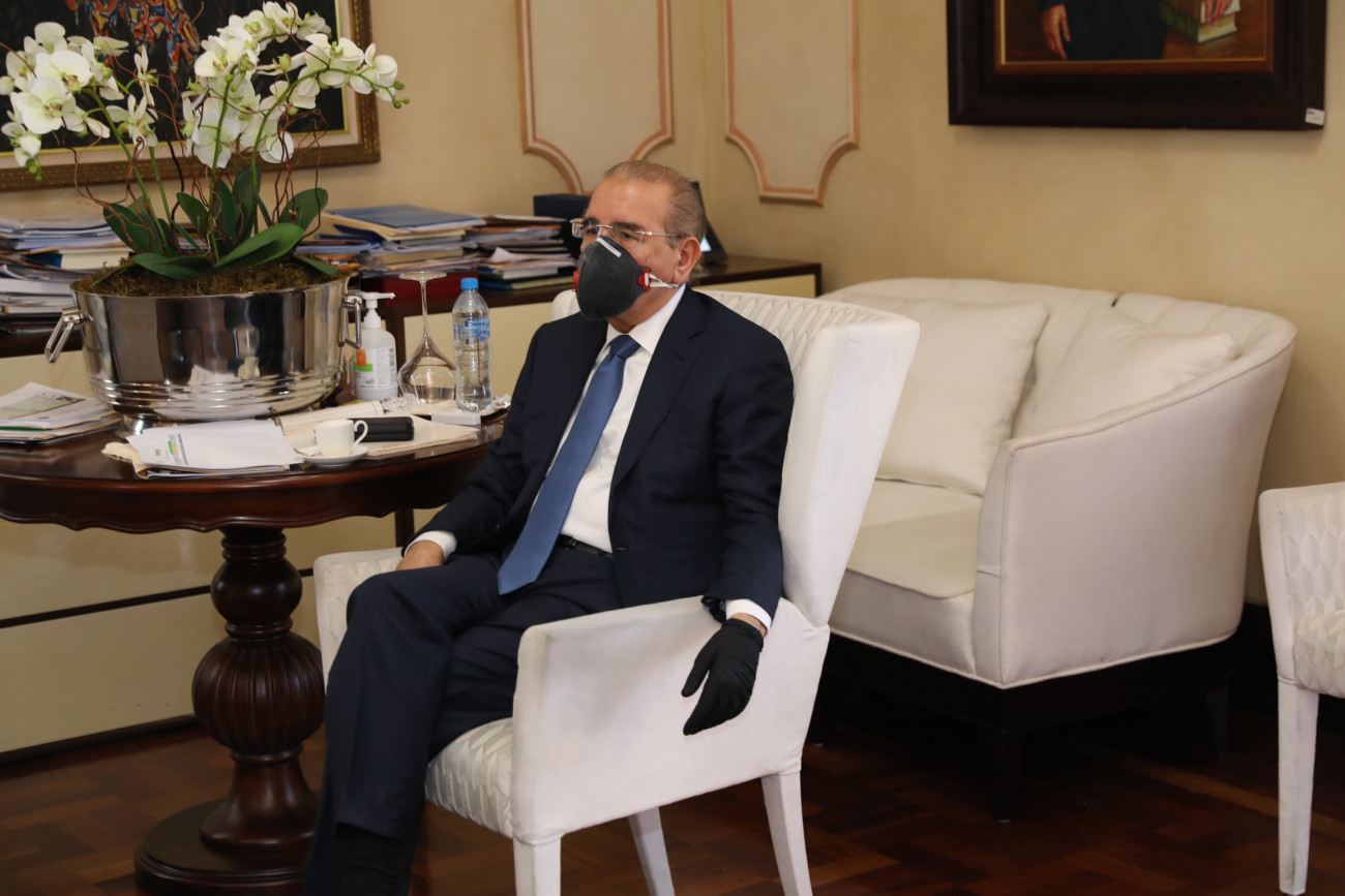 Presidente Danilo Medina, durante la sesión de trabajo que se realizó con todas las medidas preventivas, incluyendo la distancia física de poco más de un metro entre cada participante y el uso de mascarillas y guantes.