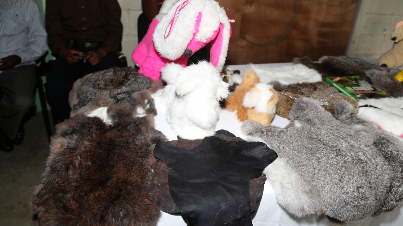 Artesanías en piel de conejo presentadas durante la visita del mandatario, elaboradas por la Asociación de Mujeres de Sábana Grande de Palenque, quienes solicitan integrarse a los proyectos de cunicultura.