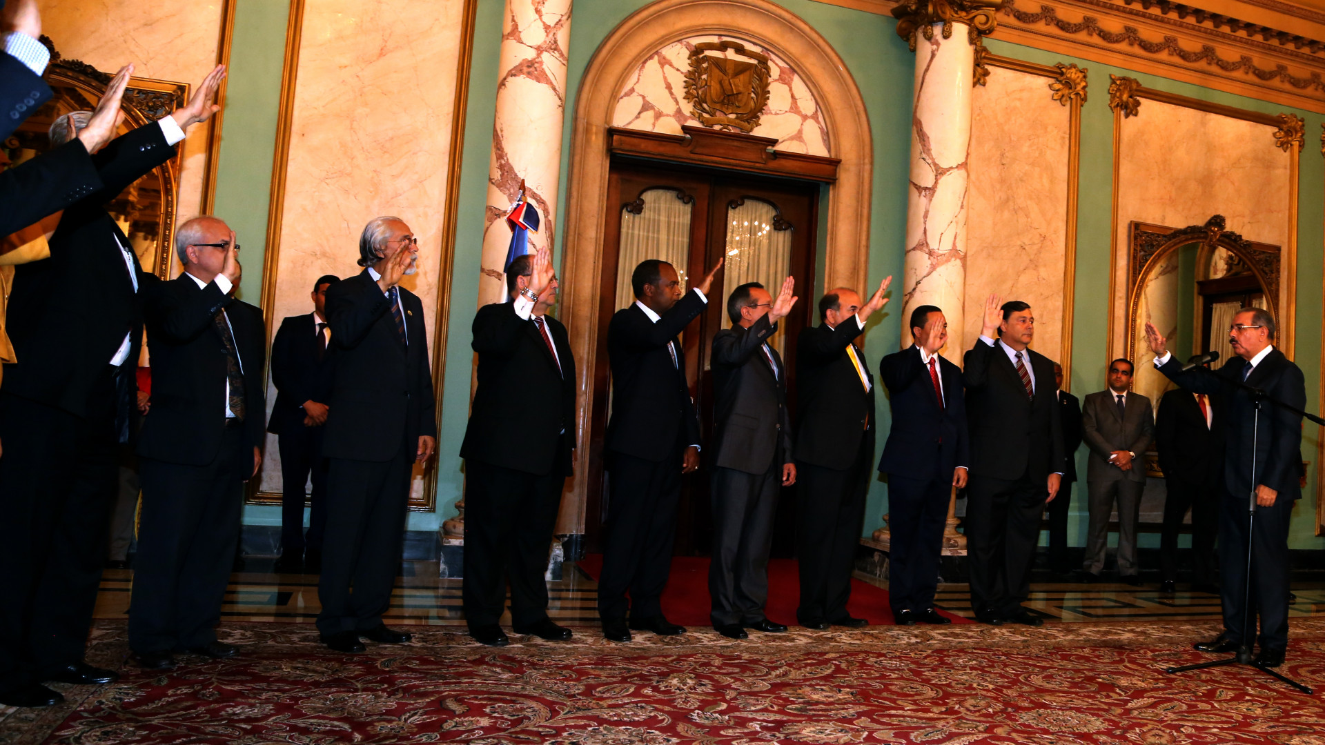 Presidente Medina junto a los nuevos ministros y viceministros de Agricultura, Energía y Minas, y Cultura, durante acto efectuado hoy en el Salón de Embajadores del Palacio Nacional.