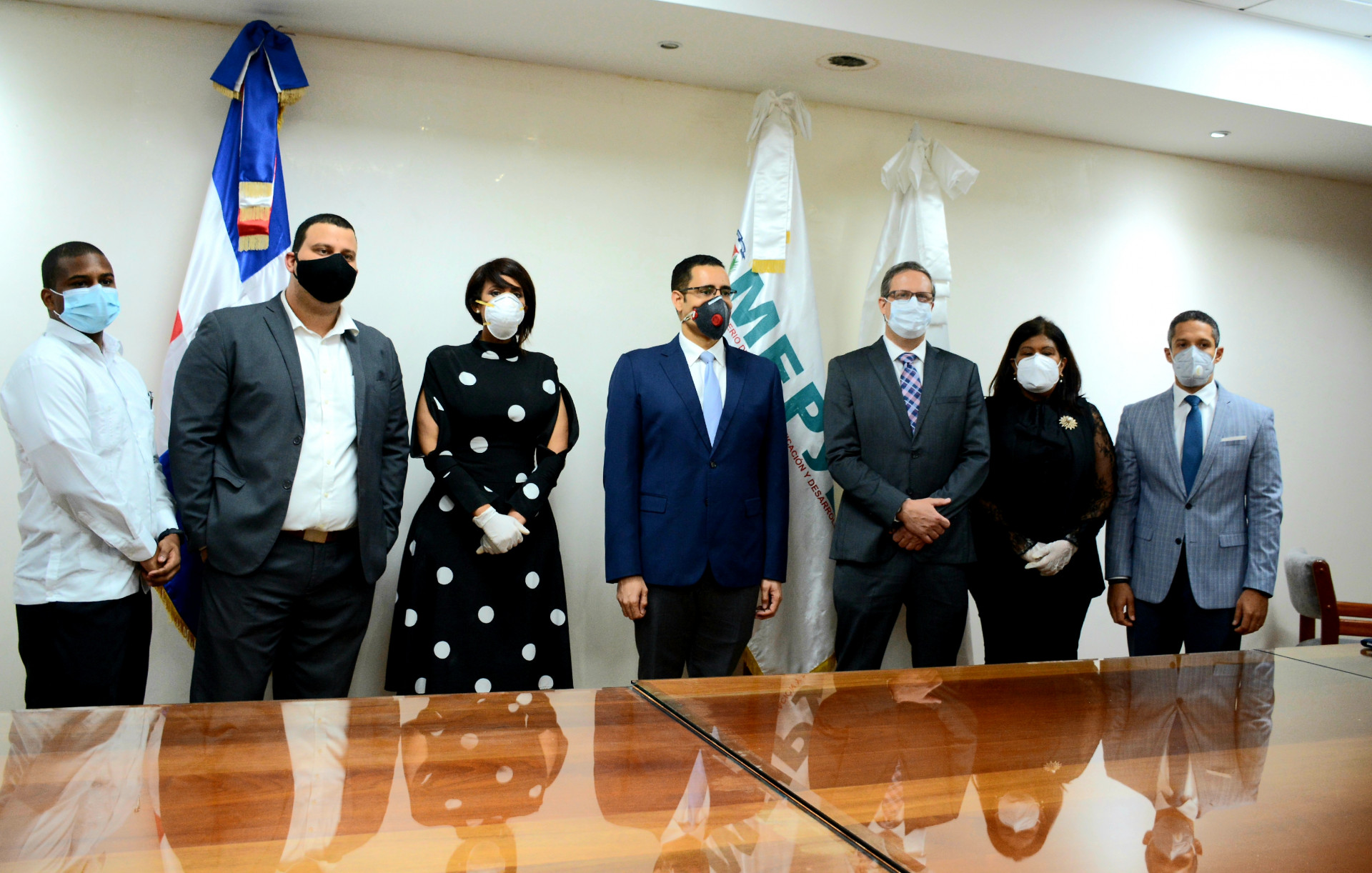 Acto de firma para la entrega de la donación encabezado por el ministro de Economía, Planificación y Desarrollo, Juan Ariel Jiménez; la viceministra de Energía Nuclear del Ministerio de Energía y Minas, Susana Gautreau De Windt, y el encargado de negocios de la Embajada de los Estados Unidos, Shane Myers.