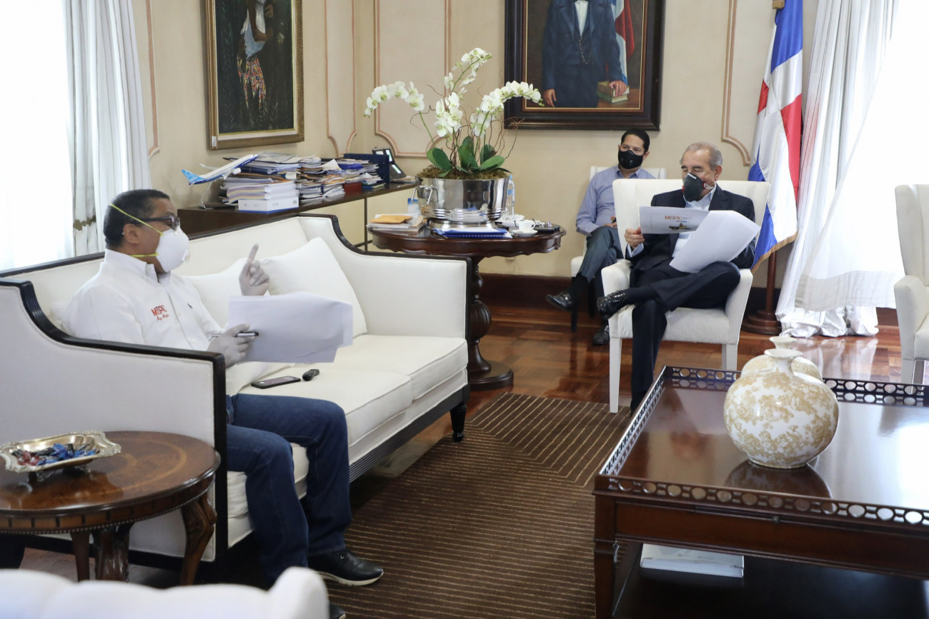 Danilo Medina recibe informe de ministro de Obras Públicas sobre avances en trabajos para sofocar incendio vertedero Duquesa