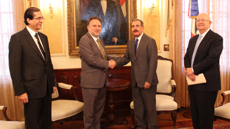 El Presidente de la República, estrecha la mano del jefe de la Misión de las Naciones Unidas para la Estabilización de Haití (Minustah), Mariano Fernández, durante la reunión sostenida en su despacho del Palacio Nacional. y a a quien recibiera junto al canciller Carlos Morales Troncoso y el ministro Gustavo Montalvo.