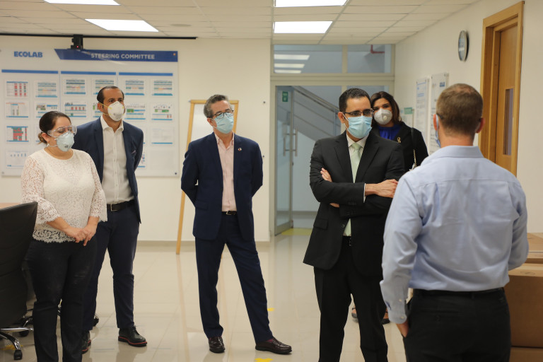 Juan Ariel Jiménez, ministro de Economía, Planificación y Desarrollo, acompañado del director de Operaciones de la empresa Ecolab-Microtek RD, Joshua Sims, encabezaron la entrega de los insumos para combatir el coronavirus (COVID-19).