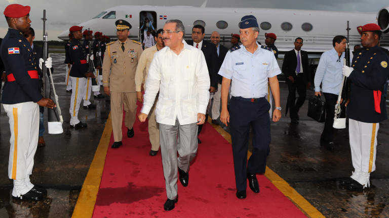 El Presidente de la República, Danilo Medina saluda a los presentes durante su regreso al país este miércoles a las 6:50 de la tarde, por la Base Aérea de San Isidro, procedente de Mérida, capital y ciudad más poblada del Estado de Yucatán en México, donde participó en la VI Cumbre de la Asociación de Estados del Caribe (AEC) Mérida-2014,