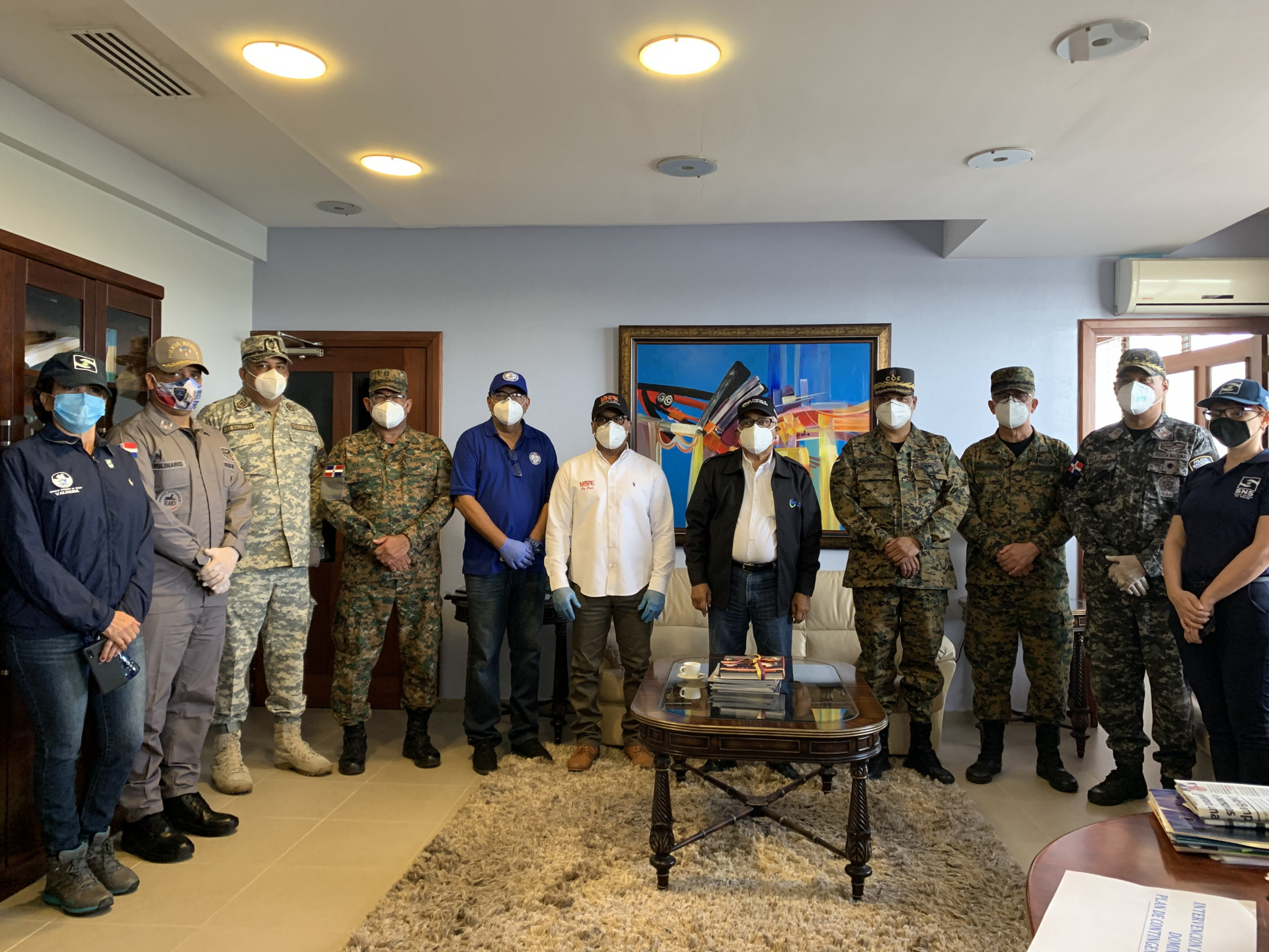 El ministro de Salud Pública, Rafael Sánchez Cárdenas estuvo acompañado del director del Centro de Operaciones de Emergencias (COE), general Juan Manuel Méndez; el ministro de Defensa, teniente general Rubén Darío Paulino Sem; el director del SNS, Chanel Rosa Chupany; el director General de la Policía Nacional, mayor general Ney Aldrin; y ministro de Obras Públicas, Ramón Antonio Pepín, entre otros participantes.
