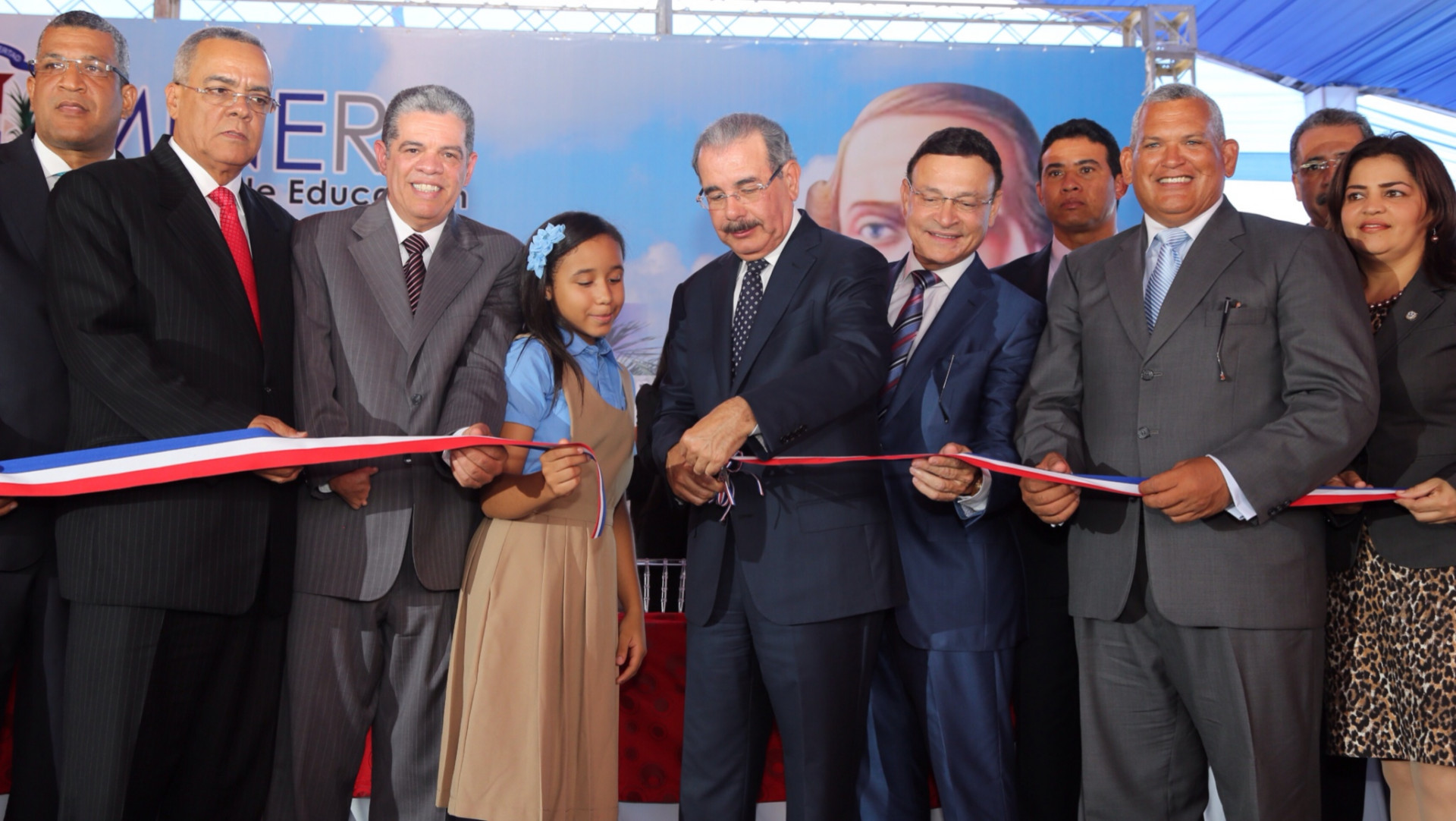 Presidente Danilo Medina junto a funcionarios del gobierno y estudiantes presentes, realizan el tradicional corte de cinta para dejar en funcionamiento los nuevos planteles escolares.