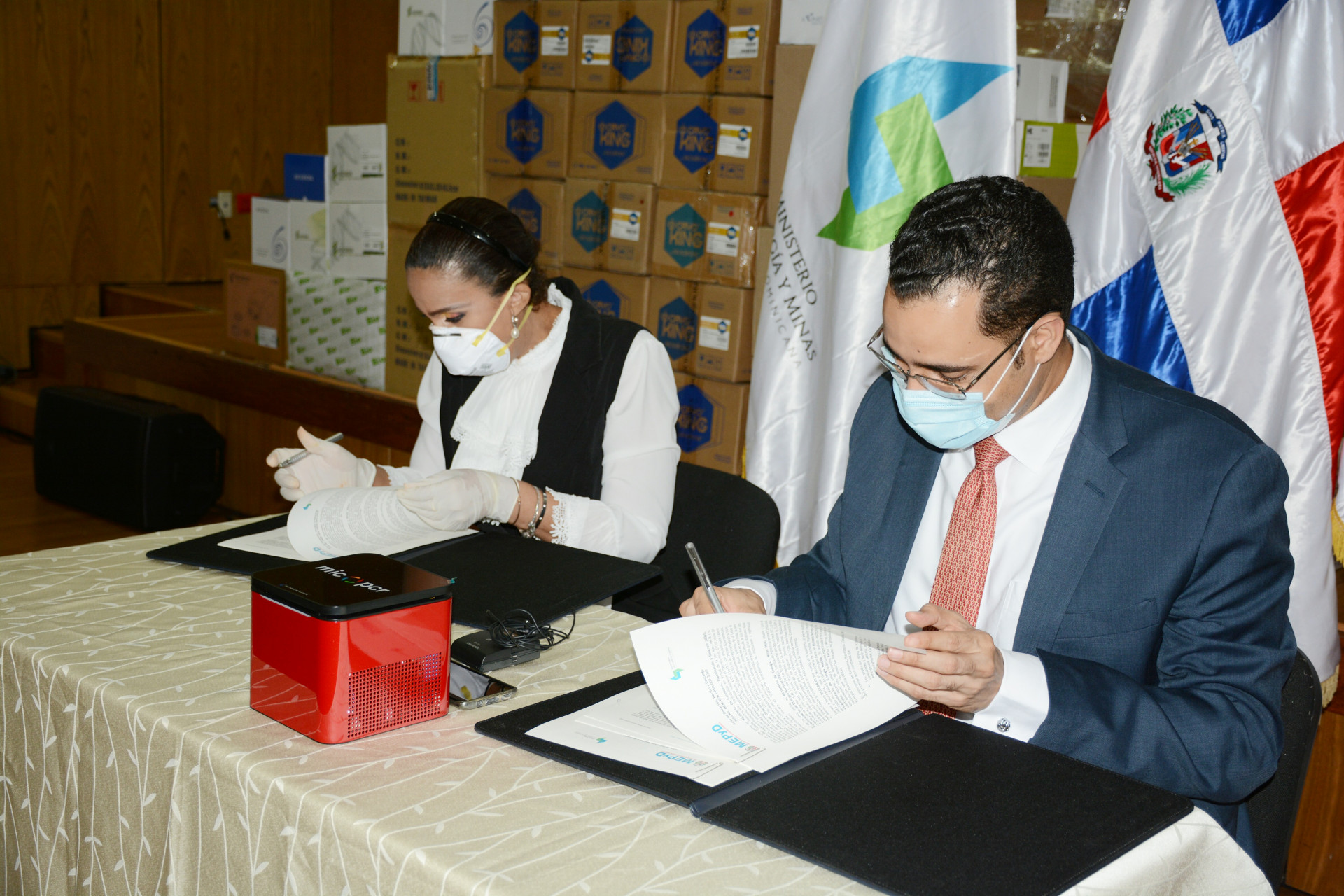 Ministro de Economía, Planificación y Desarrollo, Juan Ariel Jiménez y la viceministra de Energía Nuclear del ministerio de Energía y Minas, Susana Gautreau De Windt, durante el acto de firma para la entrega de la donación.