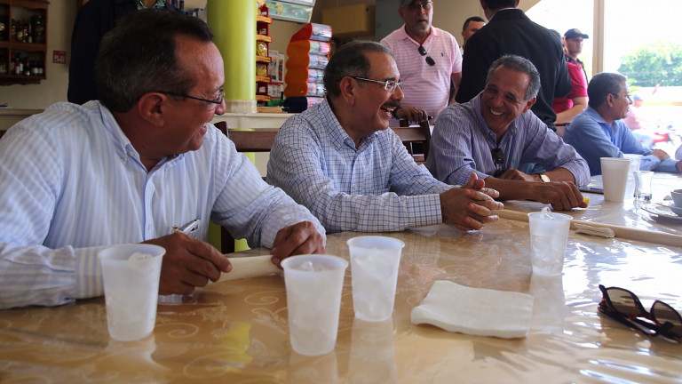 En breve parada en Comedor Hernández, el presidente Danilo Medina comparte con el ministro José Ramón Peralta, y Antonio López, entre otros.