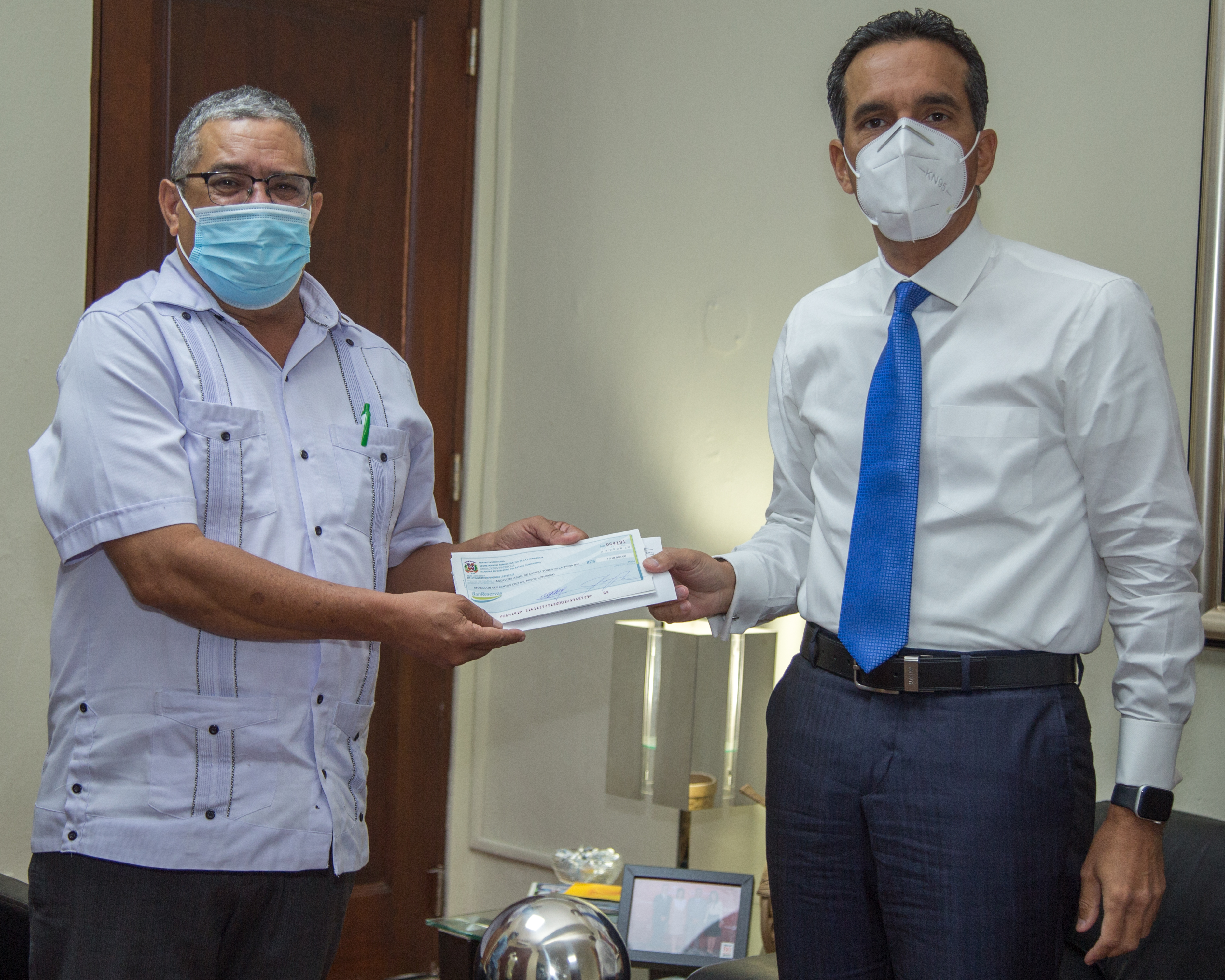 El viceministro Juan Pumarol durante la entrega del cheque a José Apolinar Hilario, presidente de la Asociación de Caficultores Villa Trina (ASCAVITRI), de la provincia Espaillat.