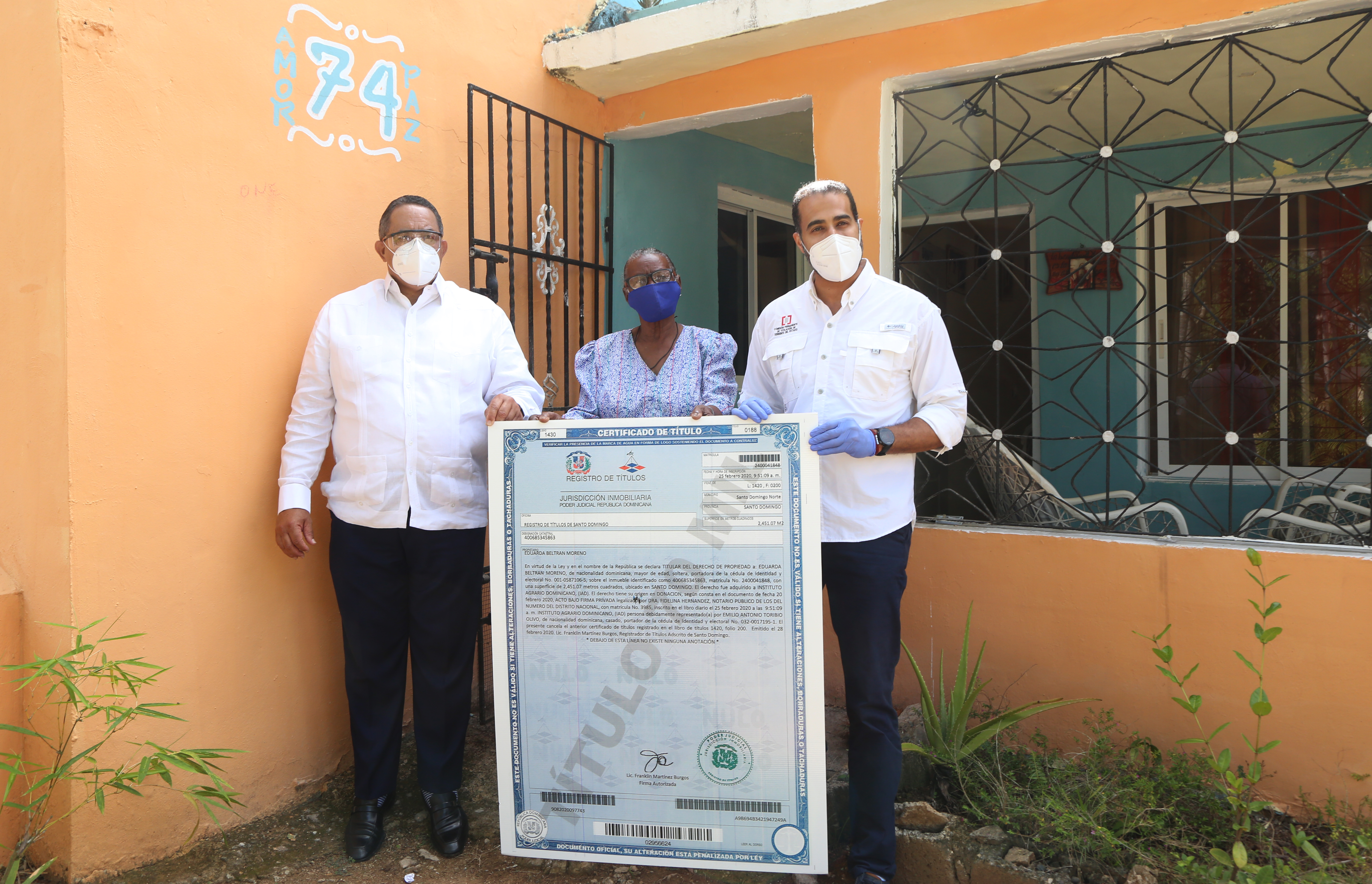 SANTO DOMINGO NORTE. - El Gobierno del presidente Danilo Medina entregó el título de propiedad número 70 mil a Eduarda Beltrán Moreno, de 81 años, residente en Hacienda Estrella, donde se titularon 1,750 familias, beneficiando a más de 7 mil personas.