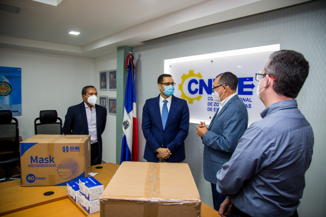 El ministro de Economía, Planificación y Desarrollo, Juan Ariel Jiménez recibió las mascarillas de protección donadas por Aeropuerto Cibao y empresa Gildan, durante breve acto en la sede del CNZFE.