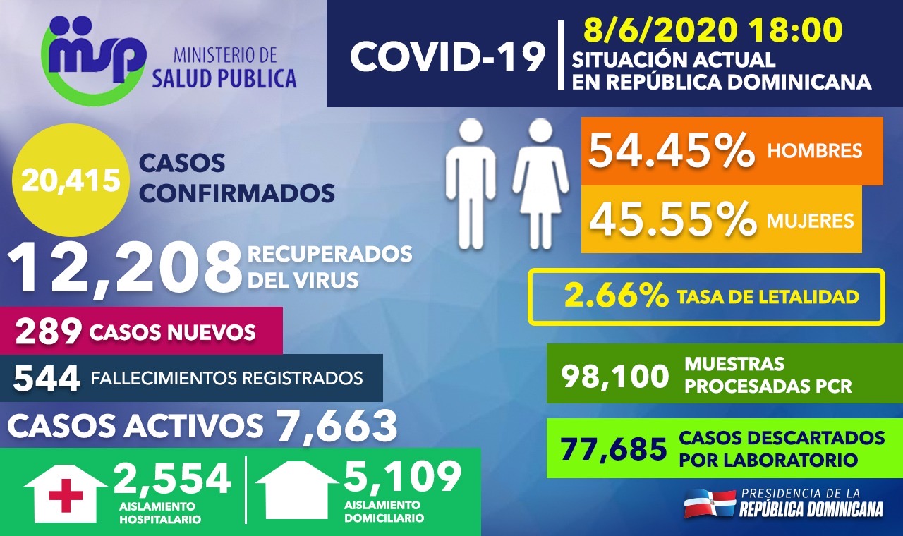 El Ministerio de Salud Pública informó que la tasa de letalidad en el país por coronavirus (COVID-19) continua en descenso, situándose en 2.66% y que la cantidad total de recuperados aumentó a 12,208. Estos datos, están contenidos en el boletín especial número 82 al corte de las 6:00 de la tarde del 8 de junio de 2020.