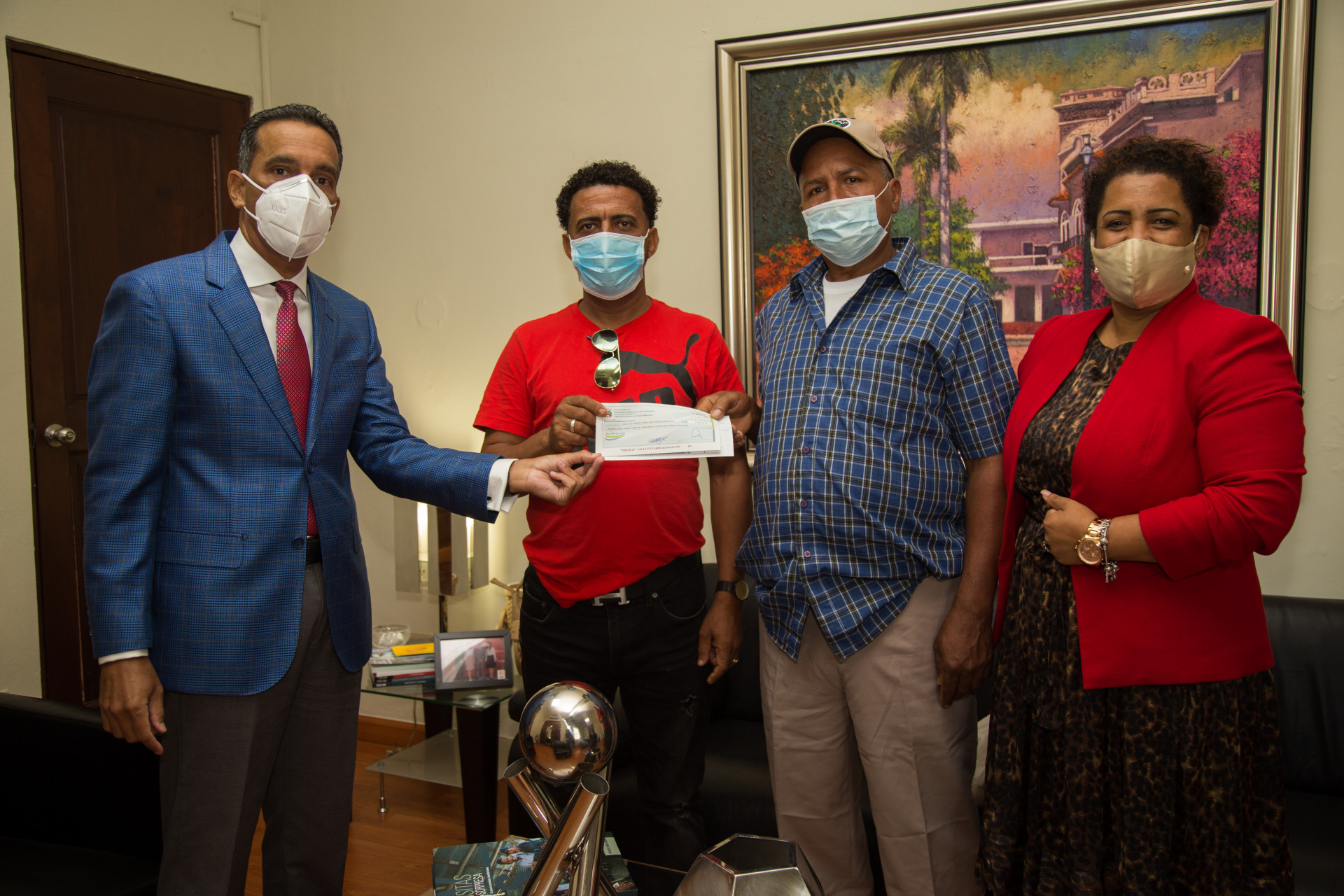 José Ramón Tejada, presidente de la Asociación de Agricultores San José de Majagual, recibió el cheque que será destinado para la compra de un camión, de manos del viceministro de Producción y Desarrollo Comunitario del Ministerio Administrativo de la Presidencia, Juan Pumarol.