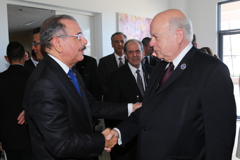 Presidente Danilo Medina Sánchez y José Miguel Insulza, Secretario General de la Organización de Estados Americanos, durante encuentro previo a los actos protocolares de la toma de posesión del nuevo presidente costarricense, Luis Guillermo Solís, que tendrán efecto hoy, 8 de mayo.