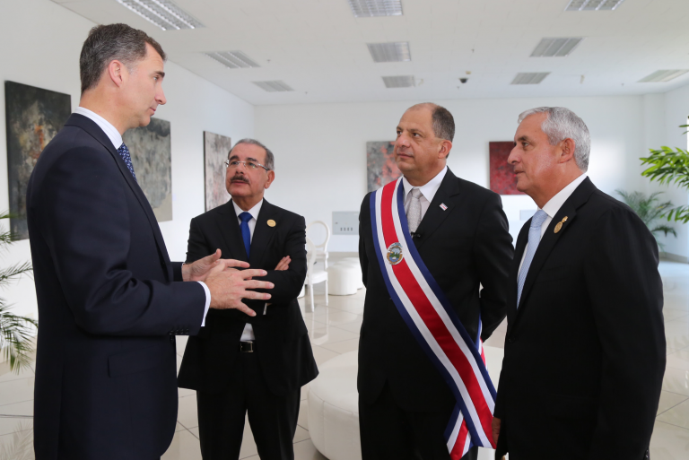 A la izquierda, el Príncipe de Asturias, Felipe de Borbón y Grecia; el presidente dominicano, Danilo Medina; Luis Guillermo Solís, presidente costarricense y Otto Pérez Molina, presidente de Guatemala.
