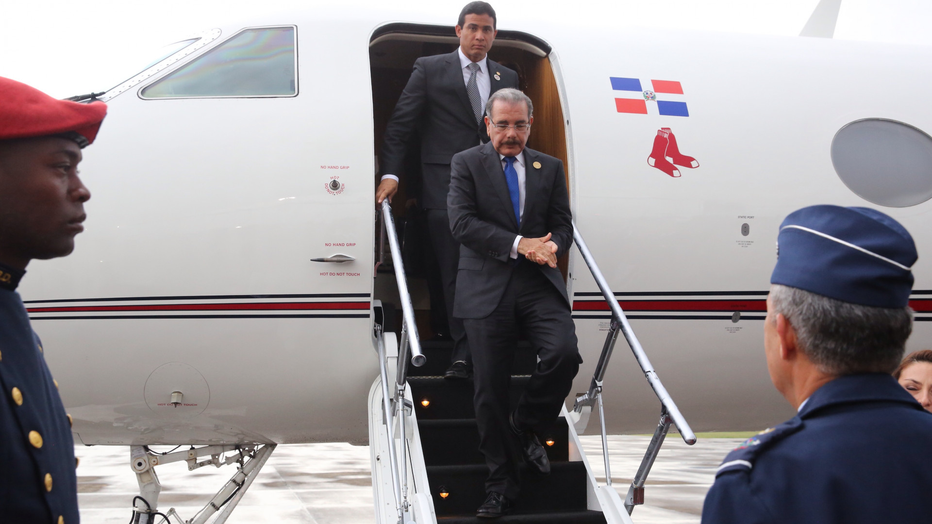Presidente Danilo Medina durante su regresó al país procedente del Aeropuerto Internacional Juan Santamaría, a las 6:10 de la tarde, del mismo día, por la Base Aérea de San Isidro, tras participar en la ceremonia de juramentación de su homólogo de Costa Rica, Luis Guillermo Solís.