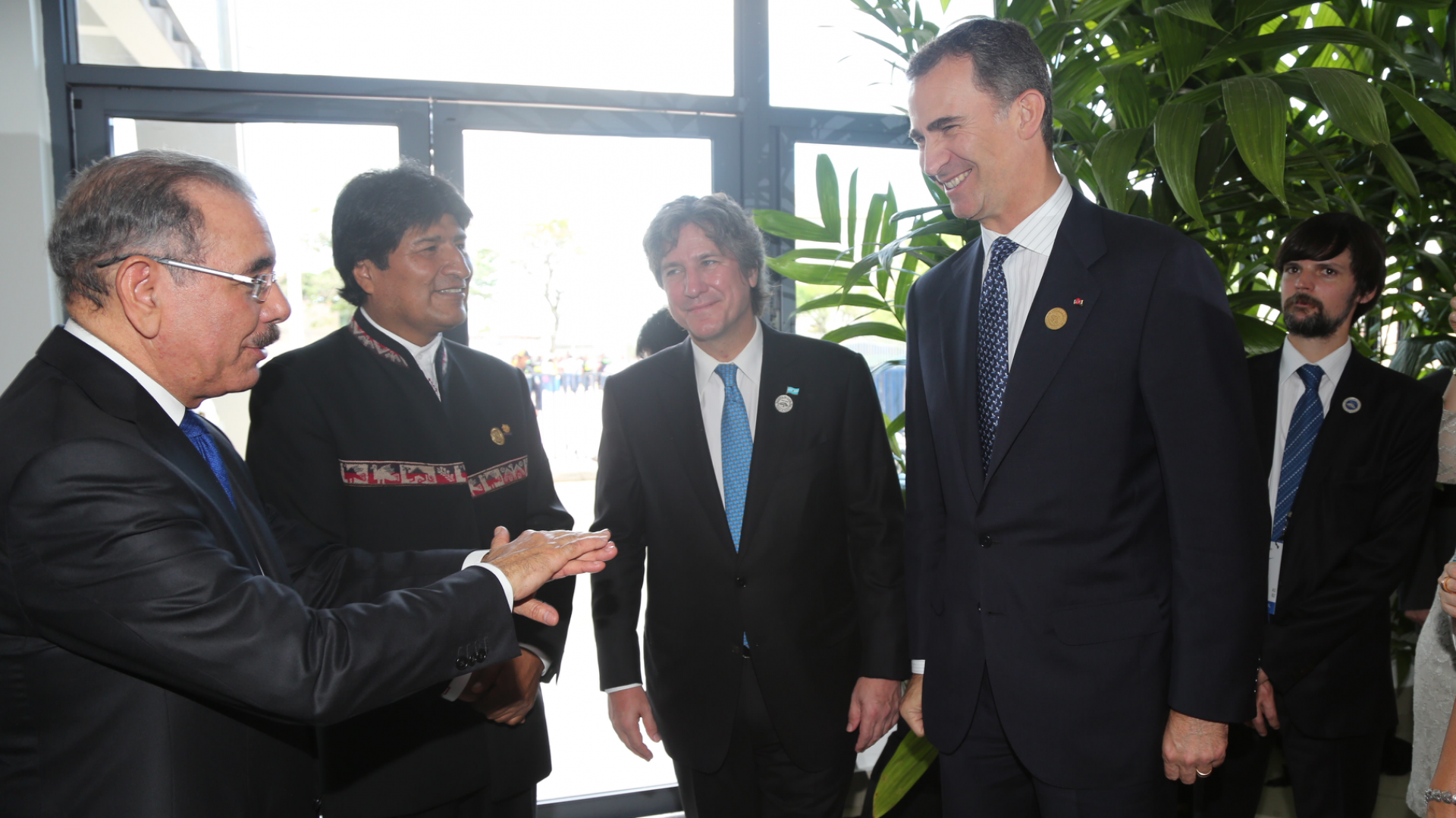 Presidente de la República Dominicana, Danilo Medina junto al Presidente del Estado Plurinacional de Bolivia, Evo Morales; el vicepresidente de Argentina, Boudou Amado, y el Príncipe de Asturias, Felipe de Borbón y Grecia, mientras intercambian saludos a su llegada a San José, Costa Rica, donde asisten para la Transmisión de Mando Presidencial.