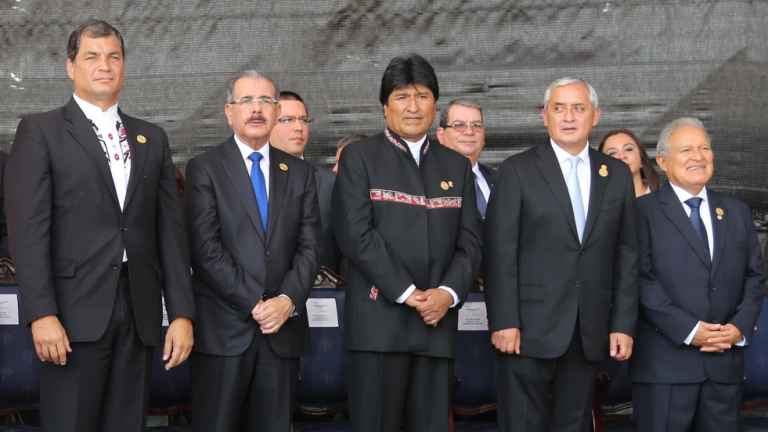 De izquierda a derecha, los presidentes, Rafael Correa,de Ecuador; Danilo Medina, de República Dominicana; Evo Morales, de Bolivia; Otto Pérez Molina, de Guatemala y Salvador Sánchez Cerén, de El Salvador; los vicepresidentes, de Venezuela, Jorge Arreaza y de Argentina, Amado Boudou, entre otros lideres presentes en la ceremonia.