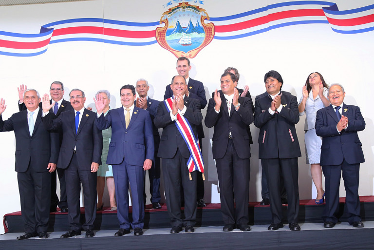 De izquierda a derecha, los presidentes, Otto Pérez Molina, de Guatemala; Danilo Medina, de República Dominicana; Juan O. Hernández, de Honduras; Luis Guillermo Solís, nuevo presidente de Costa Rica (al centro); Rafael Correa, de Ecuador; Evo Morales, de Bolivia; y Salvador Sánchez Cerén, de El Salvador; el Príncipe de Asturias, Felipe de Borbón y Grecia, entre otros distinguidos representantes, presentes en la ceremonia de Transmisión del Mando Presidencial de Costa Rica.
