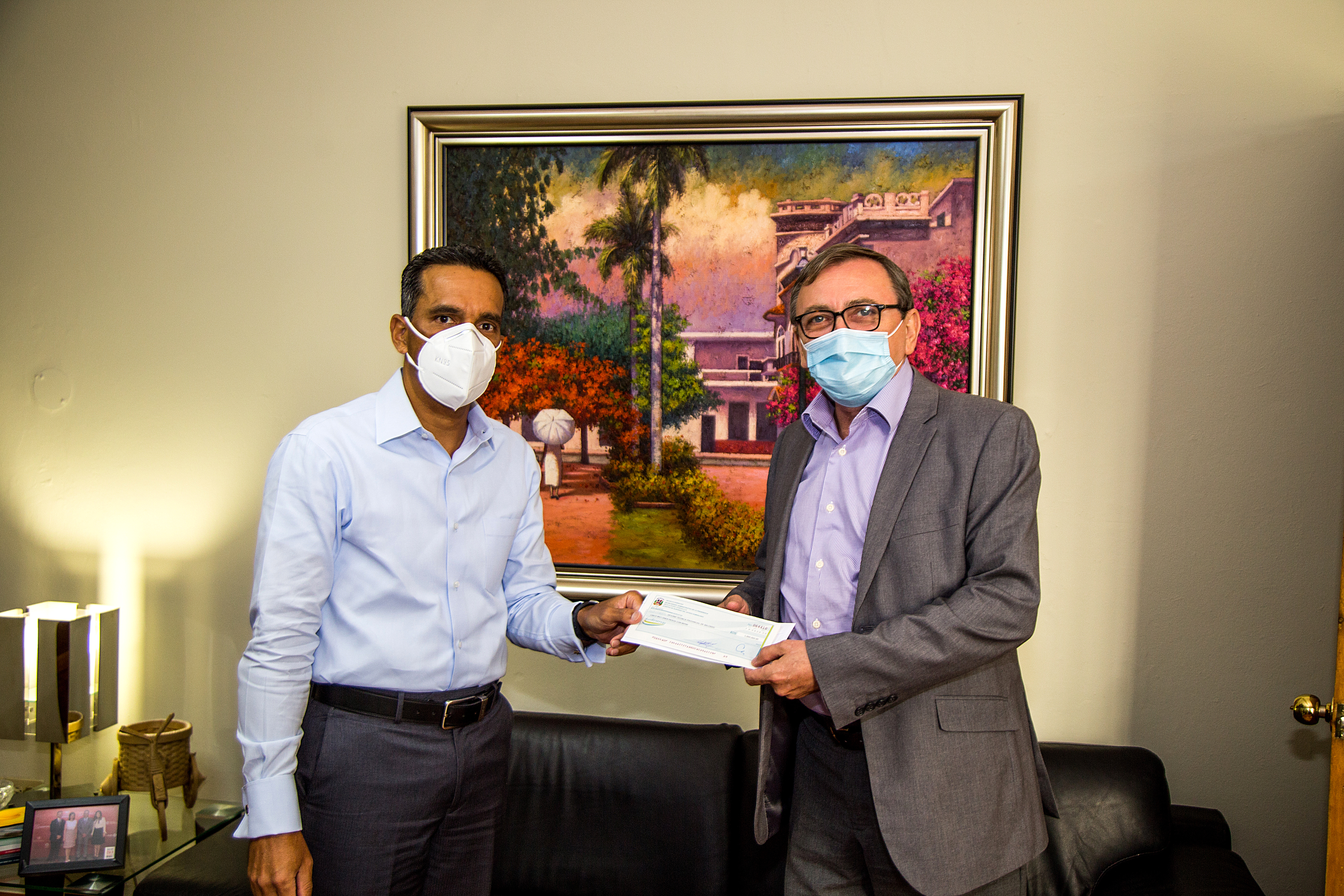 El viceministro de Producción y Desarrollo Comunitario del Ministerio Administrativo de la Presidencia, Juan Pumarol, y el coordinador de la Oficina Técnica Provincial, Luciano Bertozzo, durante la entrega del cheque.