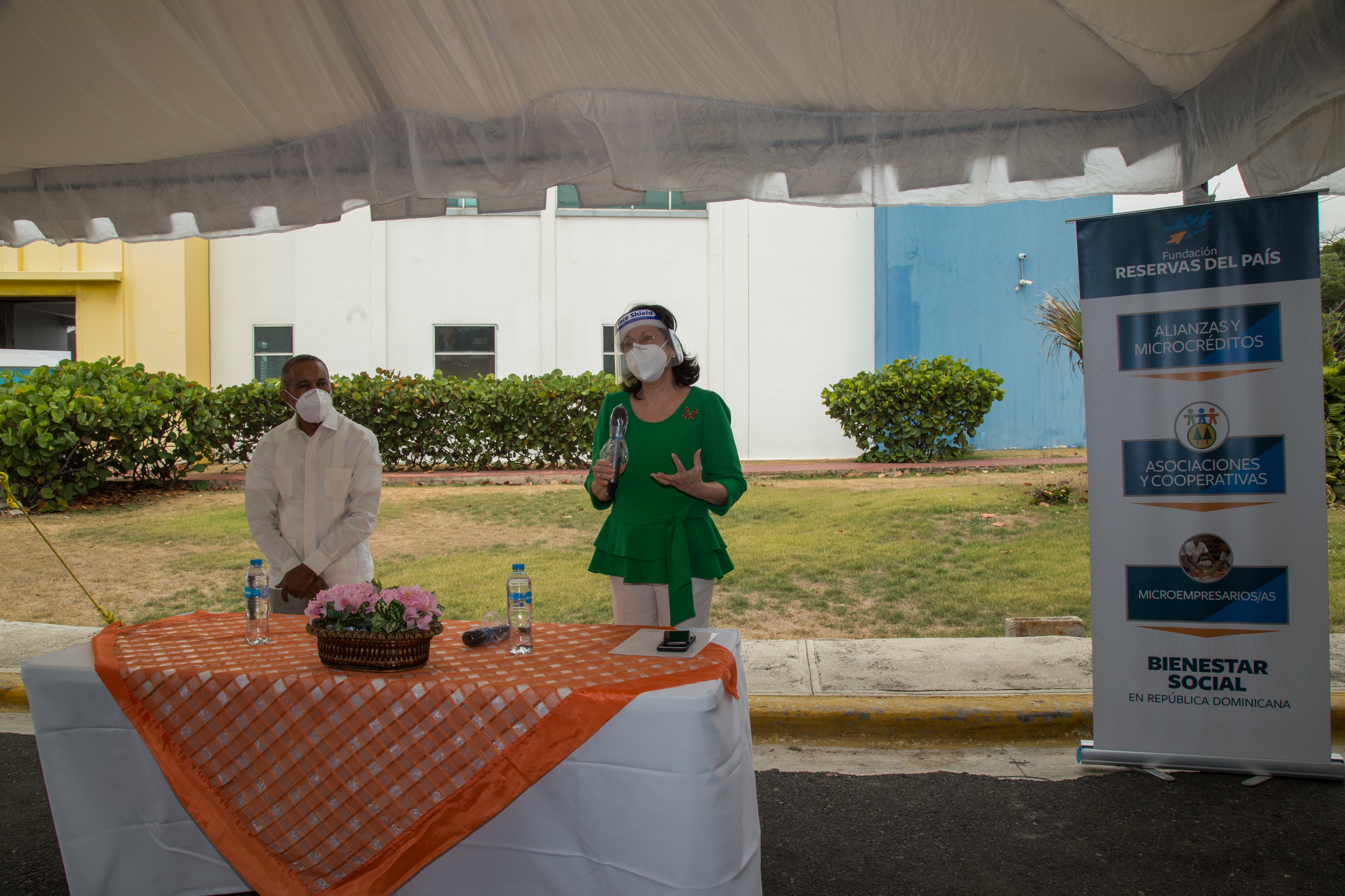 Acto de entrega de computadoras encabezado por el director ejecutivo del FEDA, Juan Francisco Caraballo, y la presidenta ejecutiva de Reservas del País, Rosa Rita Álvarez, realizado en la sede de la institución.