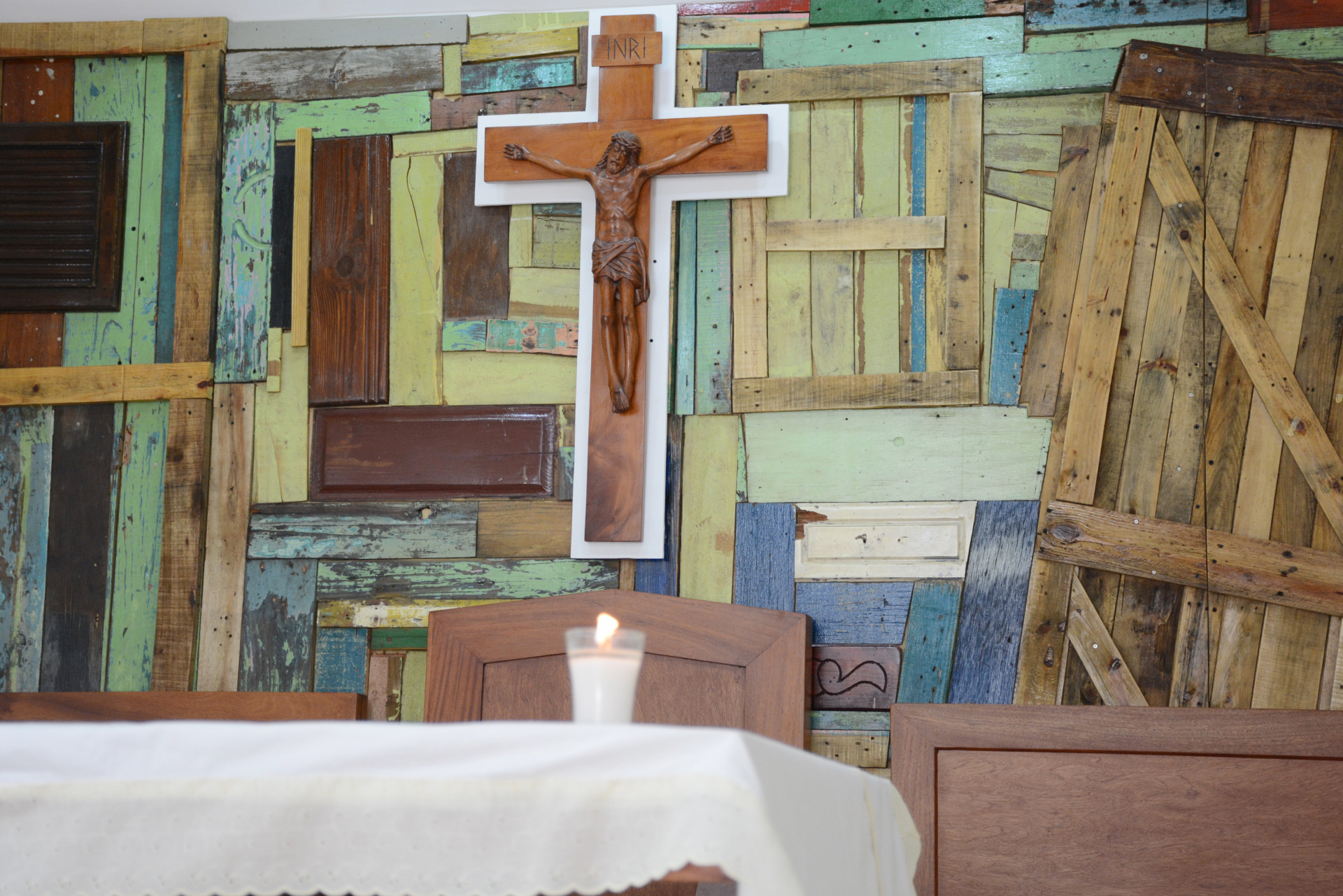 En el interior de la capilla, un mural llamado El Retablo, fabricado en madera, evoca a los orígenes de la comunidad. La obra fue construida a través de la URBE, “es un proyecto en el que la población forma parte”.