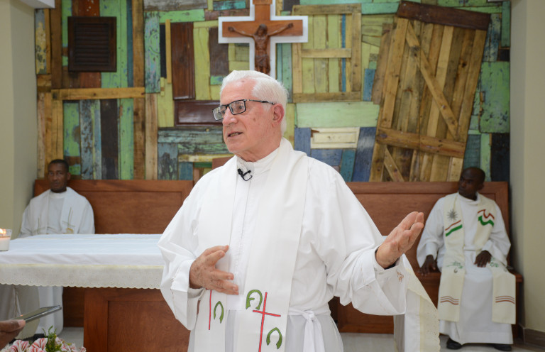 Padre Gregorio Alegría al oficiar la misa para celebrar el remozamiento de la Capilla San José, del Parque Ecológico y Fluvial de La Vieja Barquita (URBE).