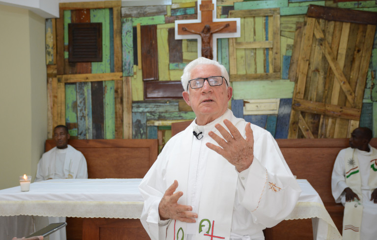 Padre Gregorio Alegría al oficiar la misa para celebrar el remozamiento de la Capilla San José, del Parque Ecológico y Fluvial de La Vieja Barquita (URBE).