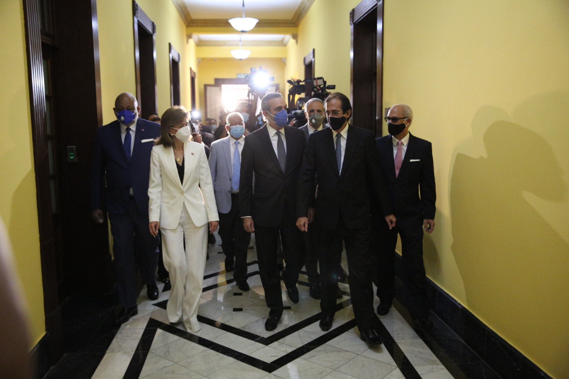 Los ministros de la Presidencia, Gustavo Montalvo; y Administrativo de la Presidencia, José Ramón Peralta; con el consultor jurídico del Poder Ejecutivo, Flavio Darío Espinal, condujeron a los visitantes hacia el despacho presidencial, donde se reunieron con el jefe de Estado.