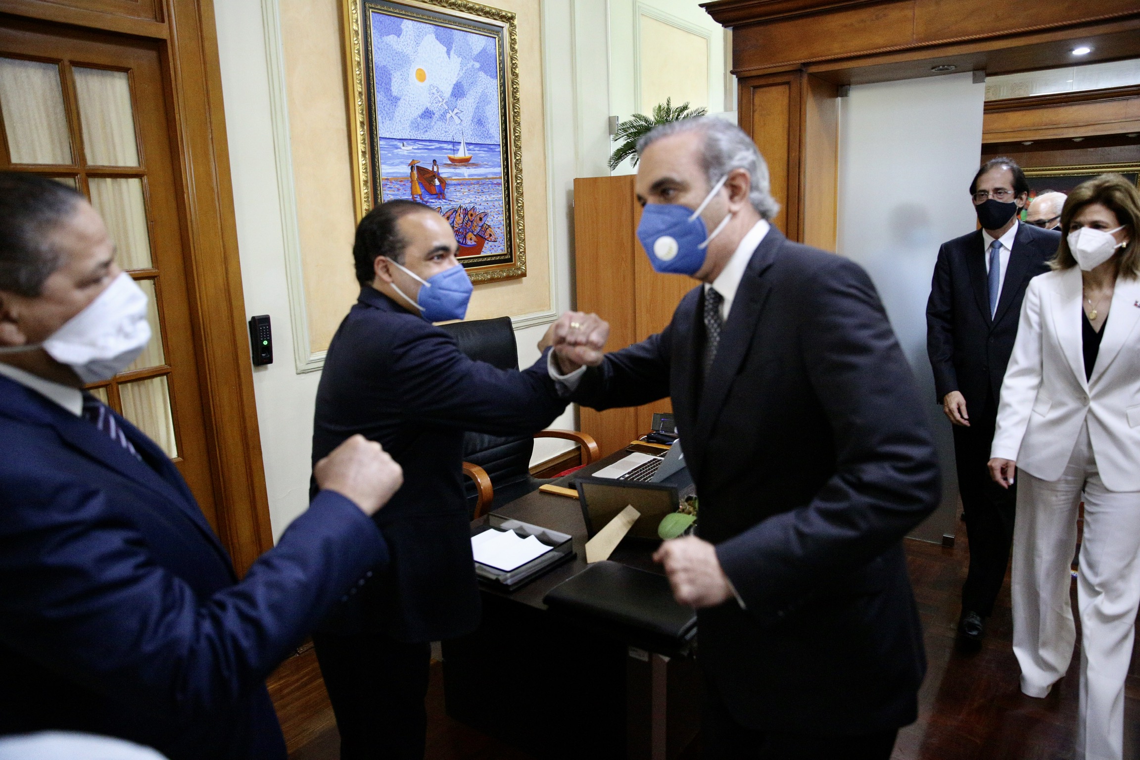 Fueron recibidos en la escalinata frontal del Palacio Nacional por los ministros de la Presidencia, Gustavo Montalvo; y Administrativo de la Presidencia, José Ramón Peralta; así como del consultor jurídico del Poder Ejecutivo, Flavio Darío Espinal, quienes condujeron a los visitantes hacia el despacho presidencial, donde se reunieron con el jefe de Estado.