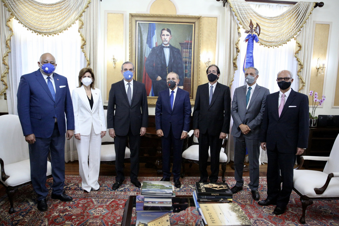Presidente Danilo Medina con el presidente y la vicepresidenta electos, Luis Abinader y Raquel Peña; el primer vicepresidente del PRM, Roberto Fulca; los ministros de la Presidencia, Gustavo Montalvo; y Administrativo de la Presidencia, José Ramón Peralta; y el consultor jurídico del Poder Ejecutivo, Flavio Darío Espinal, en el despacho presidencial del Palacio Nacional.