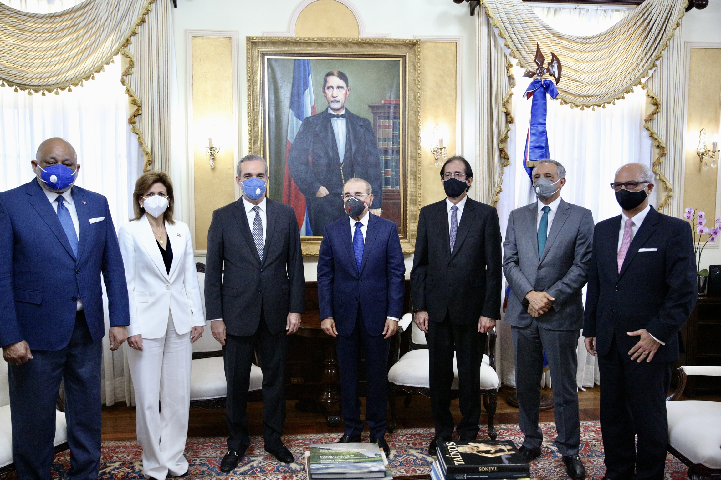 Presidente Danilo Medina con el presidente y la vicepresidenta electos, Luis Abinader y Raquel Peña; el primer vicepresidente del PRM, Roberto Fulca; los ministros de la Presidencia, Gustavo Montalvo; y Administrativo de la Presidencia, José Ramón Peralta; y el consultor jurídico del Poder Ejecutivo, Flavio Darío Espinal, en el despacho presidencial del Palacio Nacional.