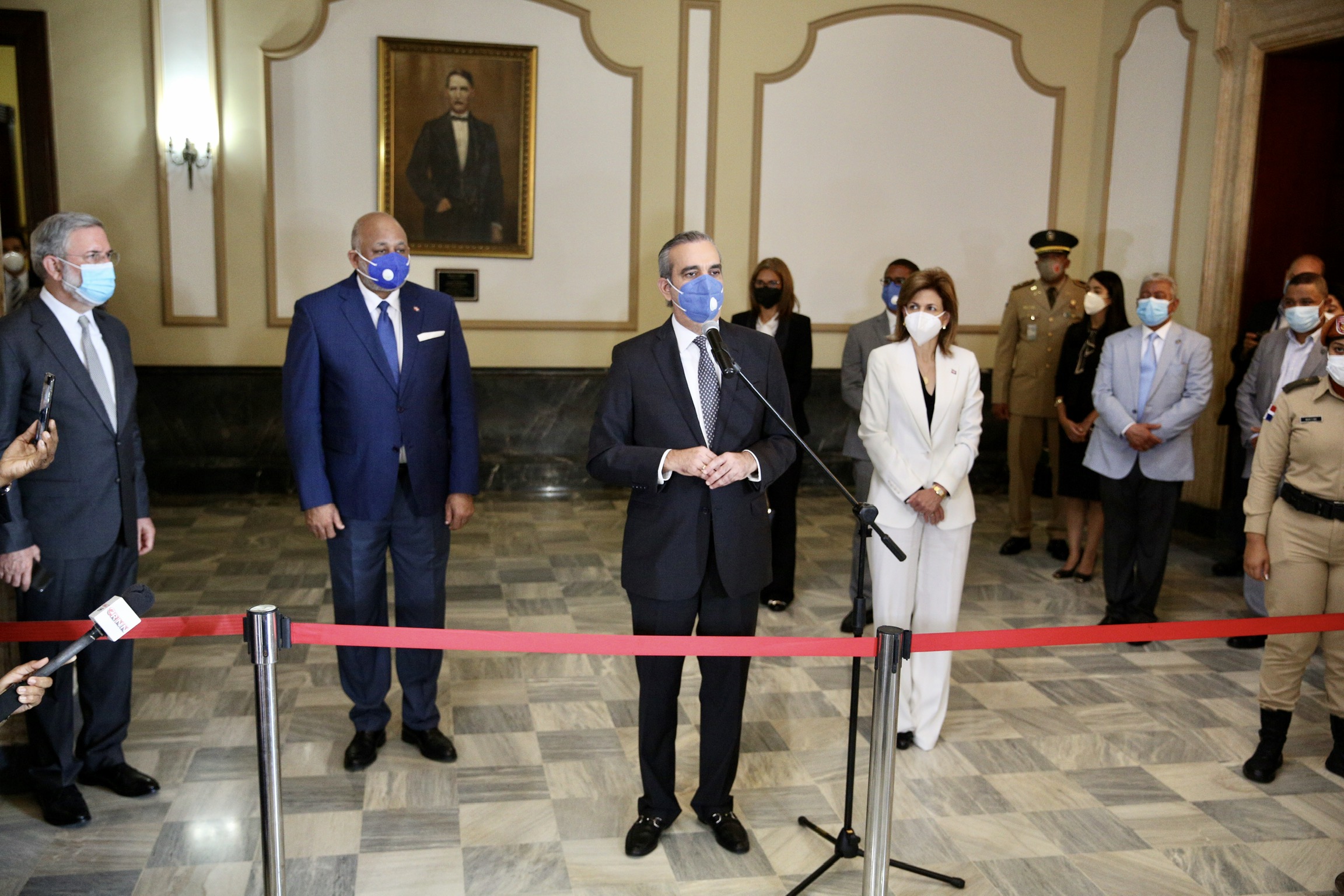 El presidente y la vicepresidenta electos, Luis Abinader y Raquel Peña, junto al primer vicepresidente del PRM, Roberto Fulcar al ofrecer declaraciones a la prensa tras finalizar su visita al presidente Danilo Medina en el Palacio Nacional.