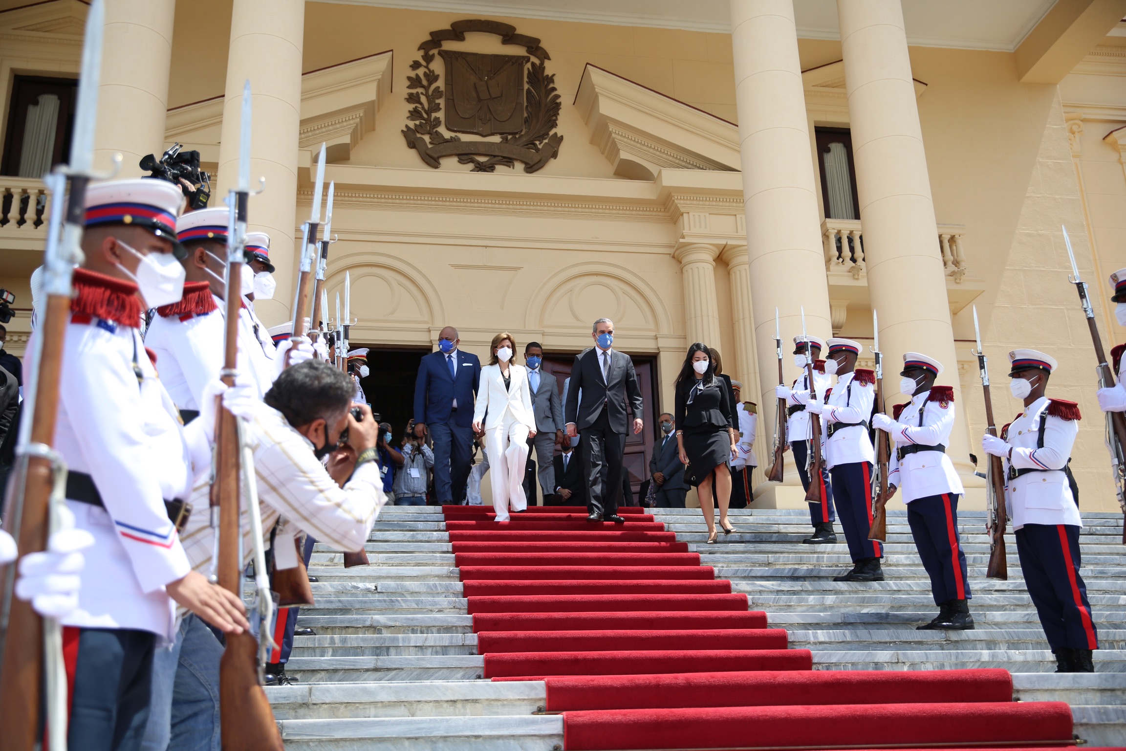 Los ministros de la Presidencia, Gustavo Montalvo; y Administrativo de la Presidencia, José Ramón Peralta, junto al consultor jurídico del Poder Ejecutivo, Flavio Darío Espinal, recibieron el presidente y la vicepresidenta electos, Luis Abinader y Raquel Peña, en la escalinata frontal del Palacio Nacional