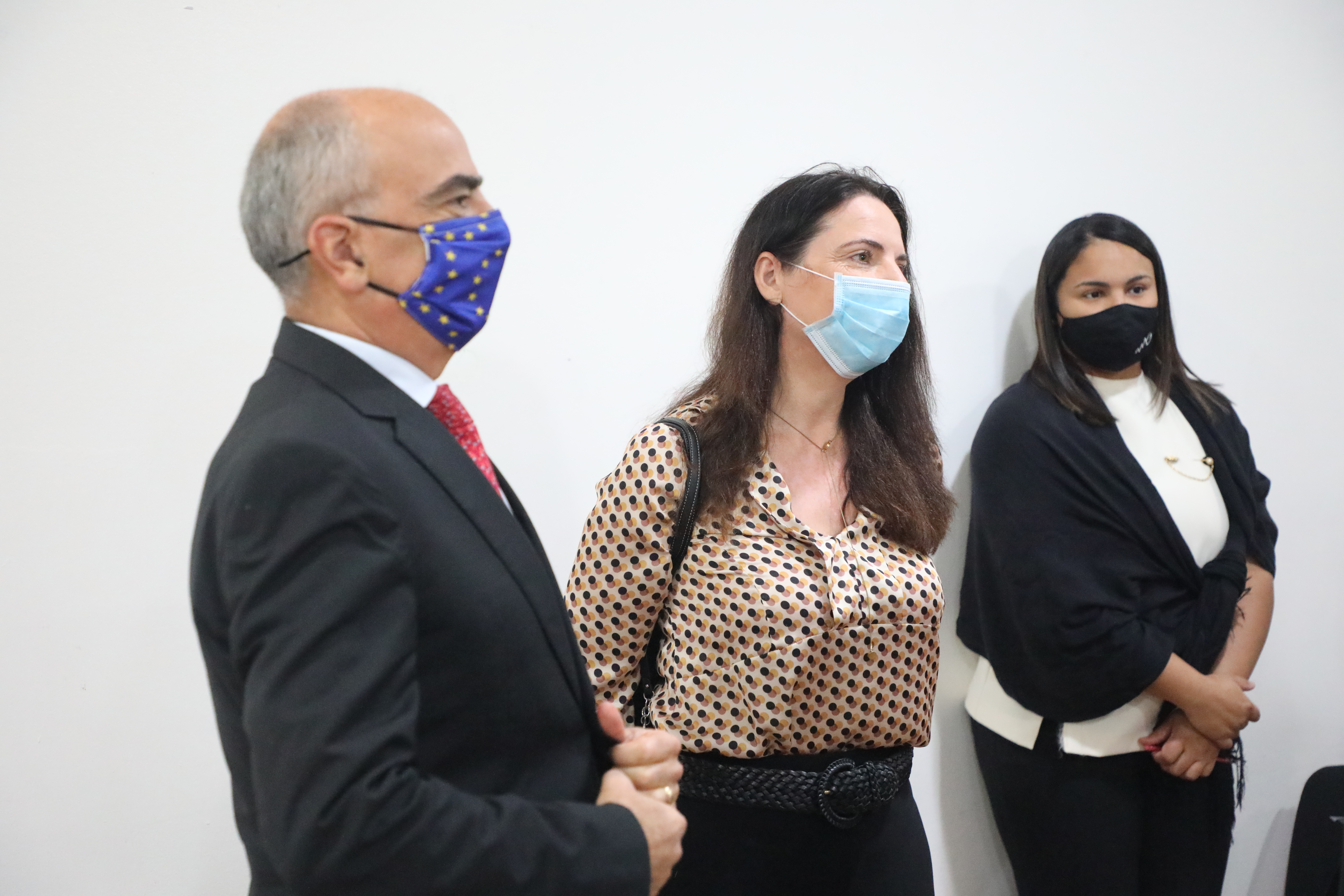Acto de entrega de la donación encabezado por el ministro de Economía, Planificación y Desarrollo, Juan Ariel Jiménez; el embajador de la Unión Europea, Gianluca Grippa; y Michelle Guzmán en representación de Chanel Rosa Chupany, director ejecutivo del Servicio Nacional de Salud.