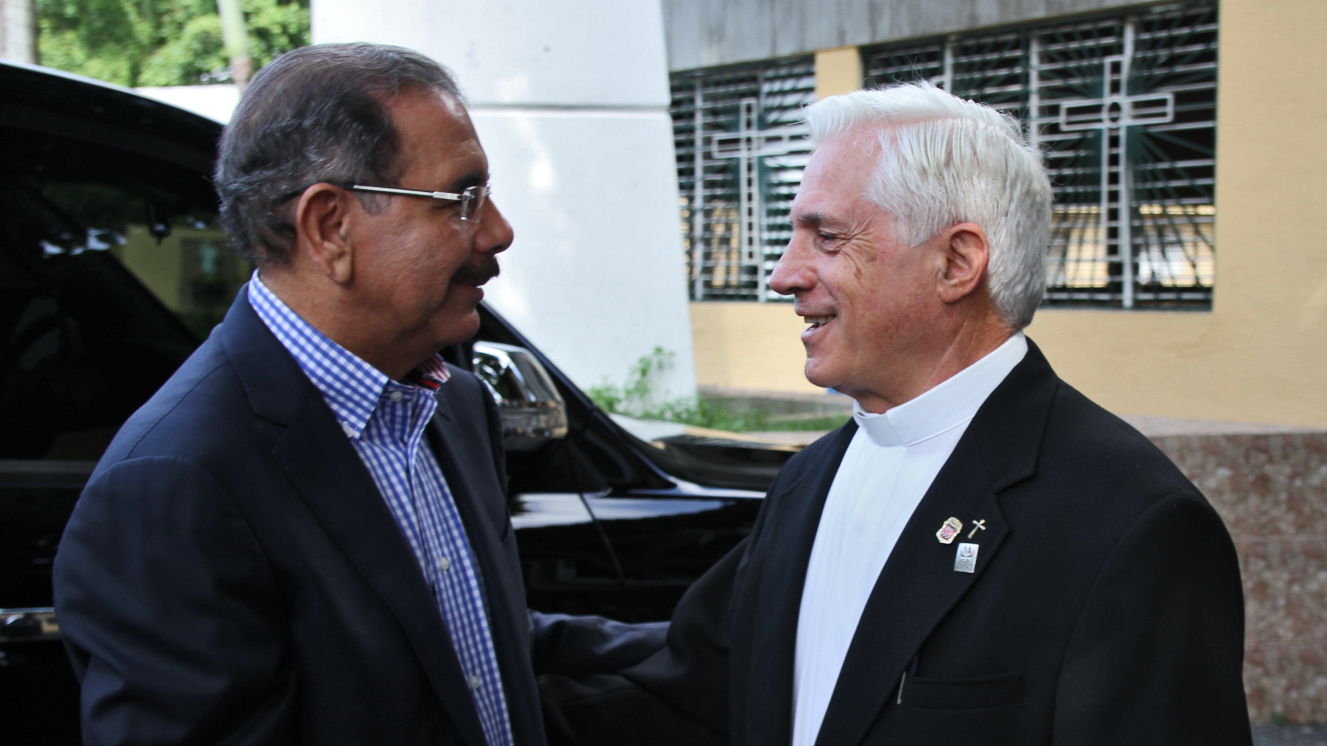 El presidente Danilo Medina en compañía del padre Gregorio Alegría Armendáriz, cura de la parroquia San Vicente de Paúl, quien también se mostró interesado en resolver los problemas de agua potable y de viviendas que enfrentan los moradores de dicha barriada.
