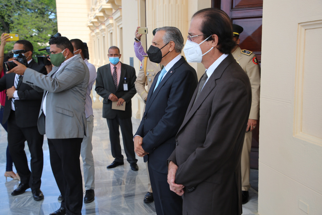Los ministros de la Presidencia, Gustavo Montalvo; Administrativo de la Presidencia, José Ramón Peralta; y el director general de Comunicación de la Presidencia (DICOM) y portavoz del Gobierno, Roberto Rodríguez Marchena recibieron al expresidente Hipólito Mejía.