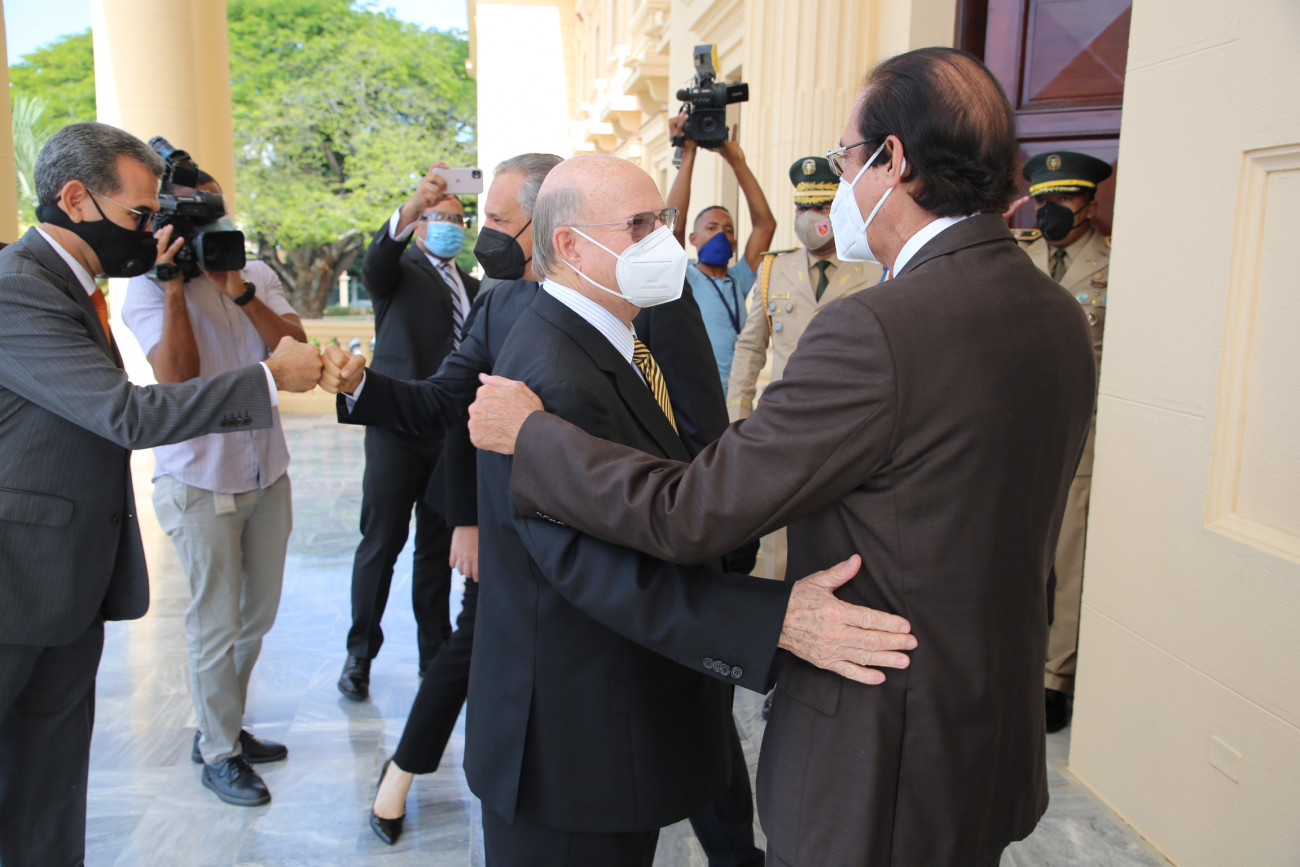 Los ministros de la Presidencia, Gustavo Montalvo; Administrativo de la Presidencia, José Ramón Peralta; y el director general de Comunicación de la Presidencia (DICOM) y portavoz del Gobierno, Roberto Rodríguez Marchena recibieron al expresidente Hipólito Mejía.