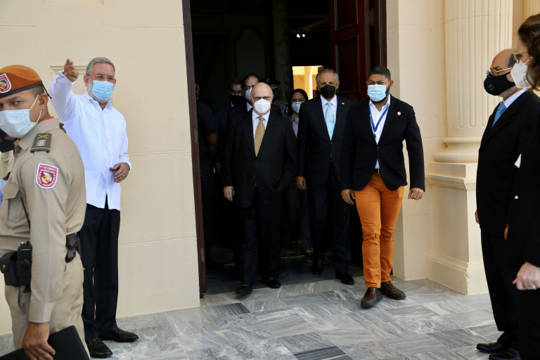 Los ministros de la Presidencia, Gustavo Montalvo; Administrativo de la Presidencia, José Ramón Peralta; y el director general de DICOM y portavoz del Gobierno, Roberto Rodríguez Marchena, mientras despiden al expresidente Hipólito Mejía, quien dijo tener una estrecha amistad con el Gobernante.