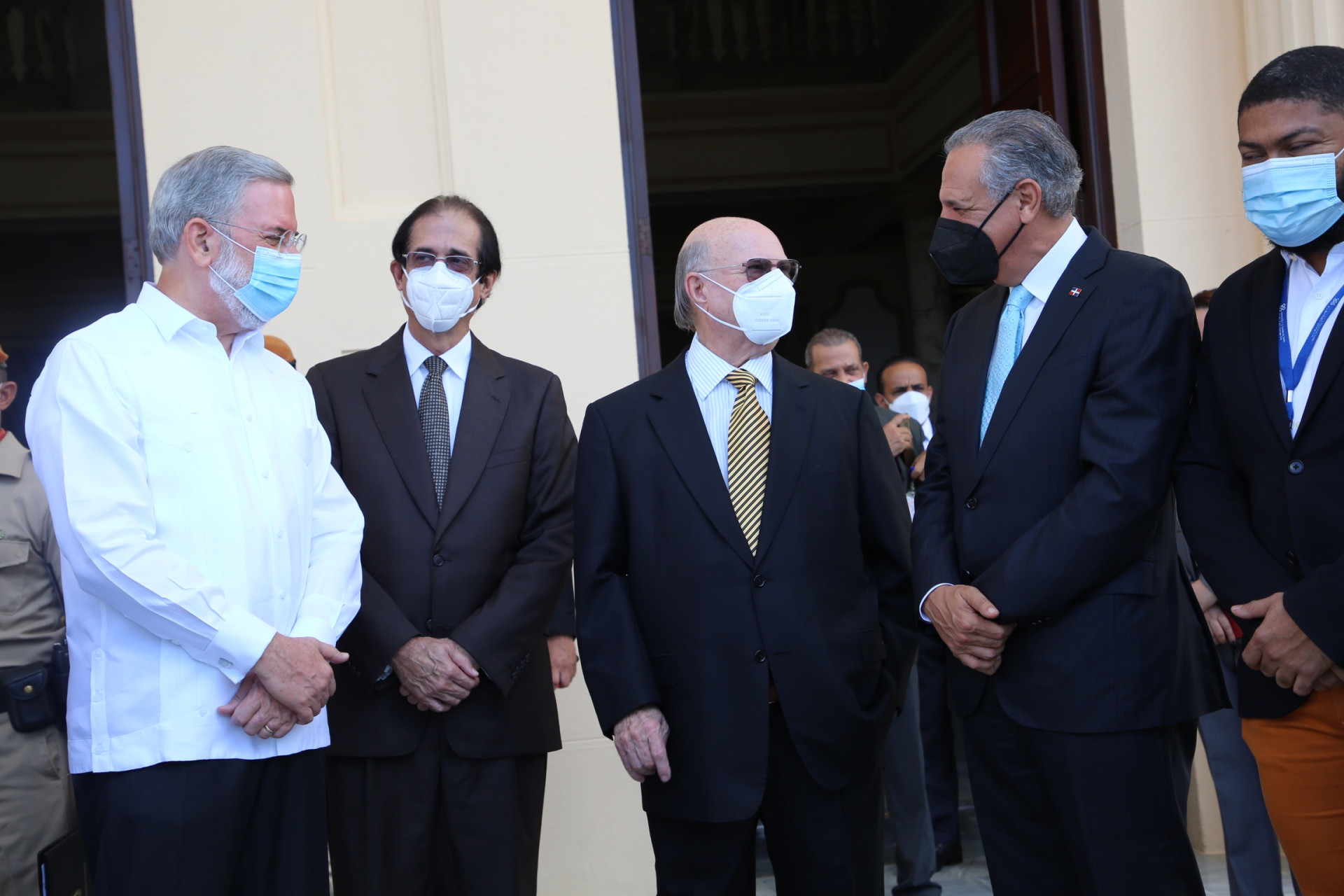 Los ministros de la Presidencia, Gustavo Montalvo; Administrativo de la Presidencia, José Ramón Peralta; y el director general de DICOM y portavoz del Gobierno, Roberto Rodríguez Marchena, mientras despiden al expresidente Hipólito Mejía, quien dijo tener una estrecha amistad con el Gobernante.